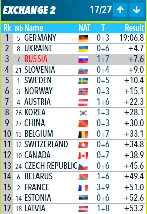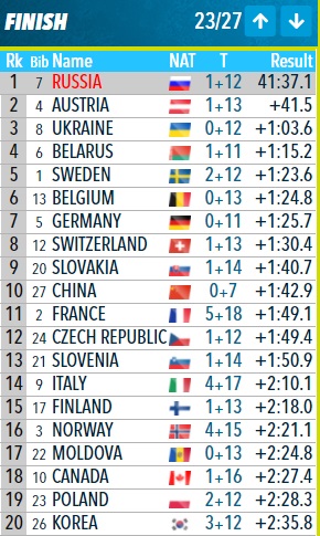 Шестой рубеж: БАБИКОВ! Пока Лессер закрывал доппатроном, Бабиков отстрелял без промахов и передал Резцовой эстафету первой! А там все намазали... У Норвегии круг, у Швеции — два!