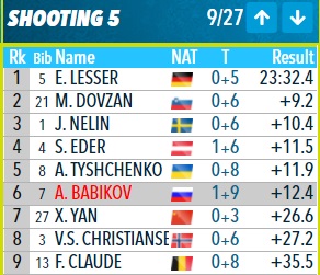 Пятый рубеж: Лессер в одиночестве пришел на лежку и промахнулся третьим выстрелом, пока соперники начинали стрелять. Все попали в порыв ветра и стали мазать. Лессер закрылся из семи, только австриец отстрелялся полностью чисто, а Бабиков тоже из семи отстрелялся и убежал шестым с +12,4.