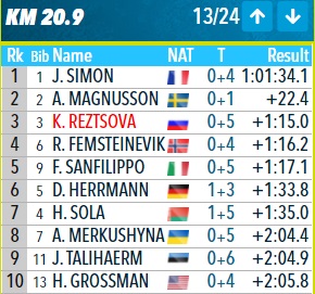Француженка Симон везет на последнем этапе 16 секунд шведке Магнуссон и 40 секунд Соле из Белоруссии. Резцова уже на шестом месте, но +1:24,9.