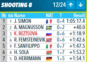 Шестой рубеж: У Бреза-Буше один промах, но она уходит лидером, хотя Кручинкина и Брурссон отстрелялись чисто! А вот Комола не обошлась без доппатрона, но закрылась первым же.