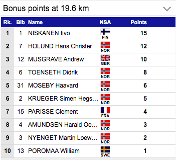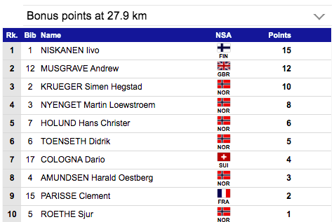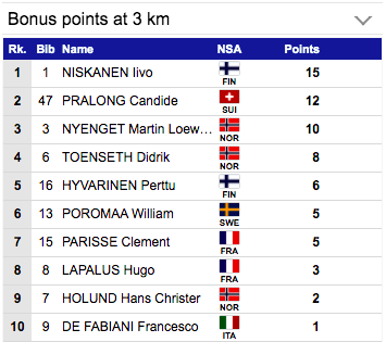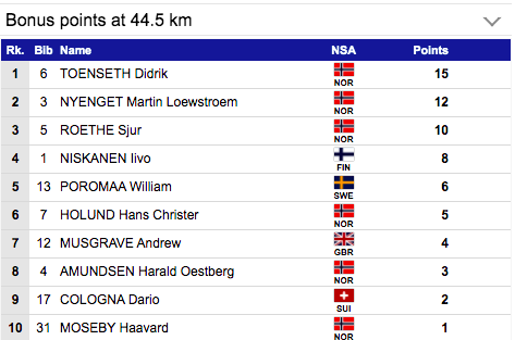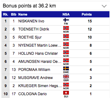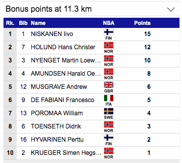 На отметке 11,3 км бонусные очки за самое быстрое прохождение этого отрезка получили следующие лыжники (снова Нисканен взял больше всех, резко вырвавшись вперед):