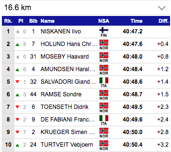 16,6 км. Нисканену не понравился быть восьмым, и он вырвался в лидеры. Холунд — второй (+0,4 секунды), еще один норвежец Мосеби — третий (+0,8), Амундсен — четвертый (+1,2), итальянец Сальвадори неожиданно поднялся на пятое место (+1,4). Топ-10 выглядит так: