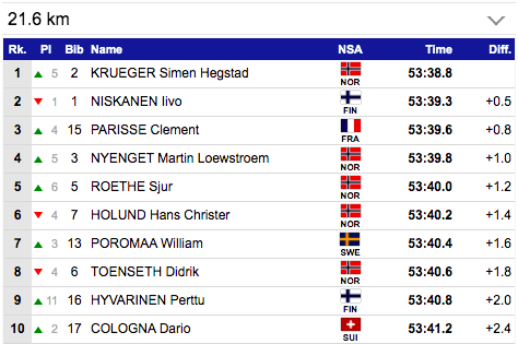 21,6 км. Топ-20 лыжников по-прежнему держатся в пределах пяти секунд — вот это плотность! Первым идет Крюгер, вторым — Нисканен (+0,5), третьим — Парисс (+0,8).