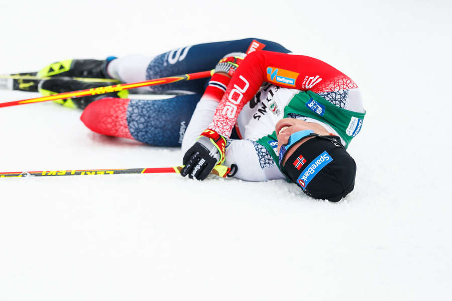 43,7 км. Ньенгет в кои-то веки уступил первую позицию, став вторым (+0,7 секунды от лидера). Возглавляет пелотон другой норвежец Тенсет, на третьем месте — Рете (+1,5). Амундсен с восьмой строчки начинает отпускать топ-7 — он проигрывает лидеру уже 15 секунд. Семь лучших лыжников на данный момент расположились в пределах 4,3 секунды.