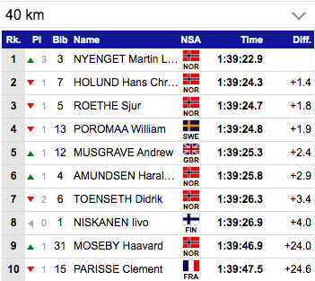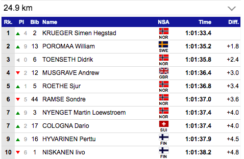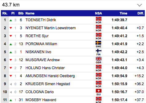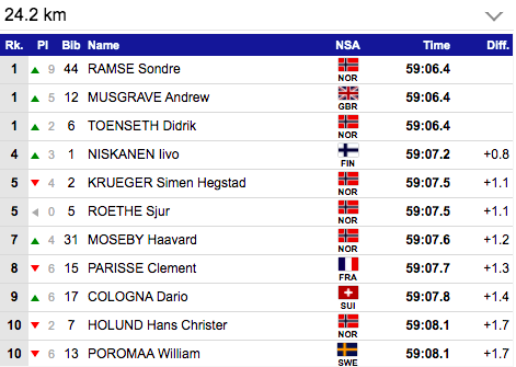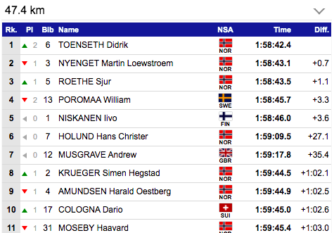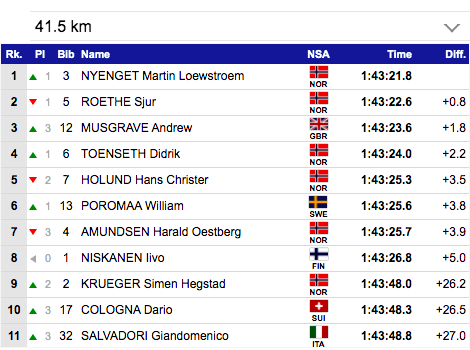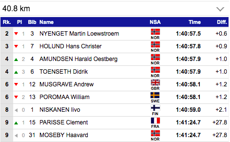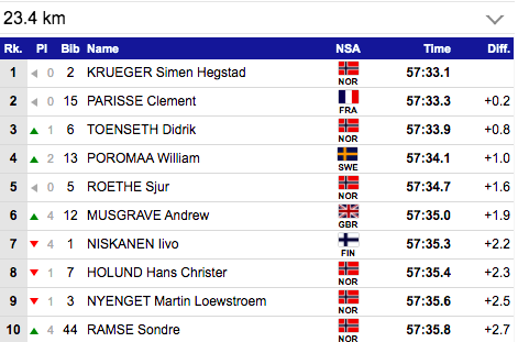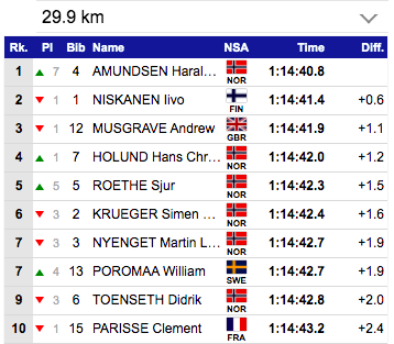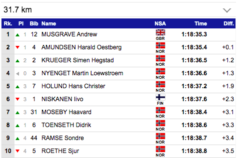 31,7 км. Вау, британец Масгрейв решил полидировать! Ноздря в ноздрю с ним идет Амундсен (+0,1 секунды), а на третьем месте — Крюгер (+1,2). Из топ-10 восемь спортсменов — норвежцы.