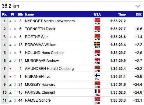 38,2 км. Топ-8 лыжников разместились в пределах четырех секунд и пошли в отрыв от остальных: норвежец Мосеби, который идет девятым, проигрывает лидеру аж 24,4 секунды. Первым сейчас стал Ньенгет, вторым — Тенсет (+0,5 секунды), третьим — Шюр Рете (+1,4).