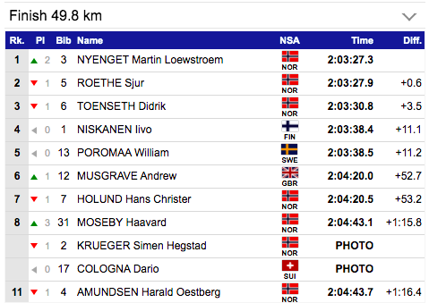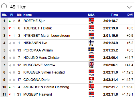 49,1 км. Финишная прямая. Рете вырвался на первую строчку, Тенсет дышит ему в спину (+0,3 секунды), Ньенгет тоже не сильно отстает (+0,9); Нисканен идет четвертым и проигрывает лидеру явно больше (+6,2), как и Поромаа (+6,5).