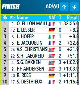 На третьей строчке — Хофер (+32 секунды), на четвертой — Кристиансен (+34), а на пятой — Лессер (+37,9). Кстати, Кристиансен и Лессер закрыли все мишени на всех огневых рубежах, но скорость подвела.