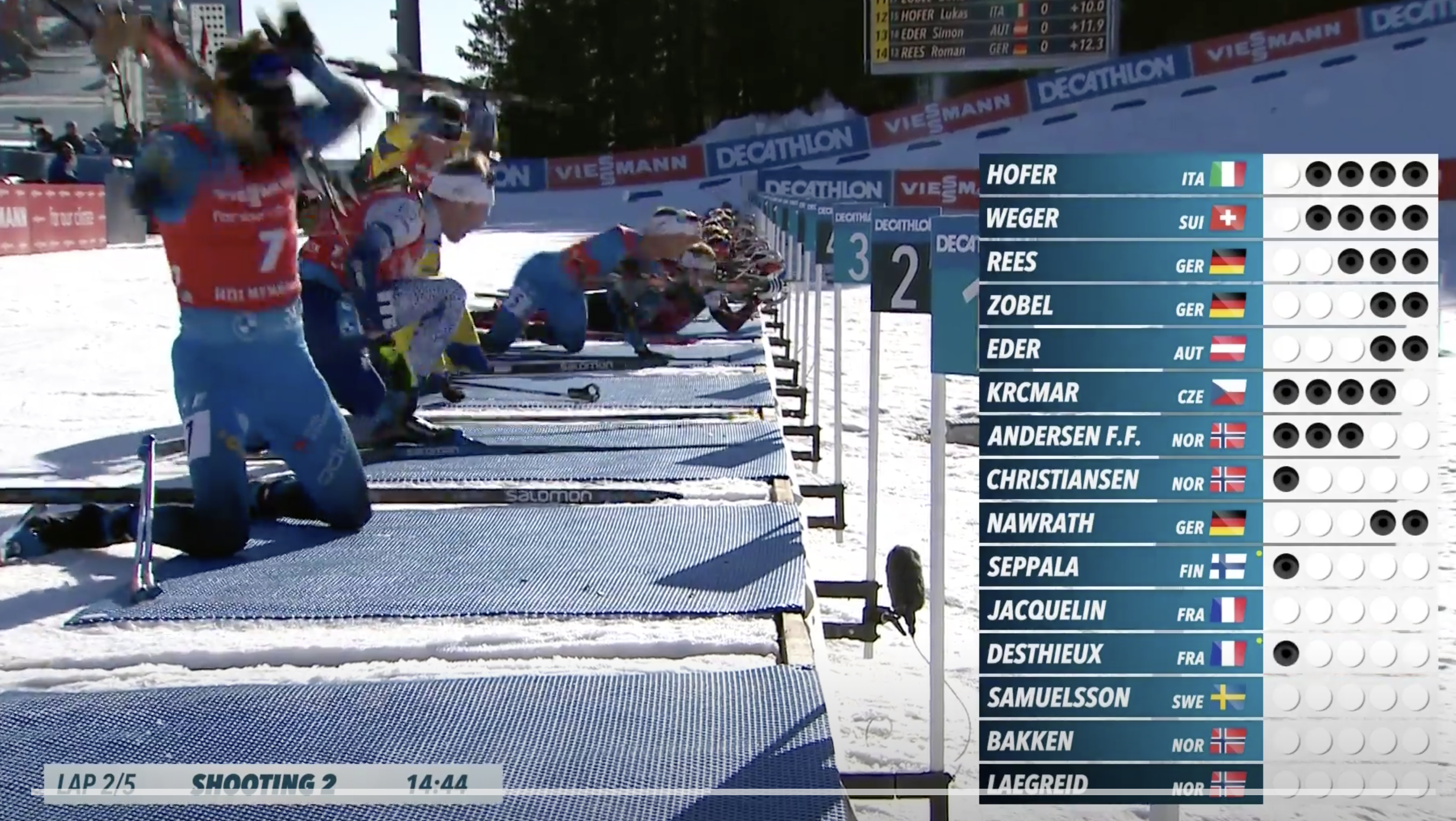 Только Дестье промахнулся среди топ-5 биатлонистов сегодняшней гонки перед второй стрельбой! Ух, какая же напряженная борьба!