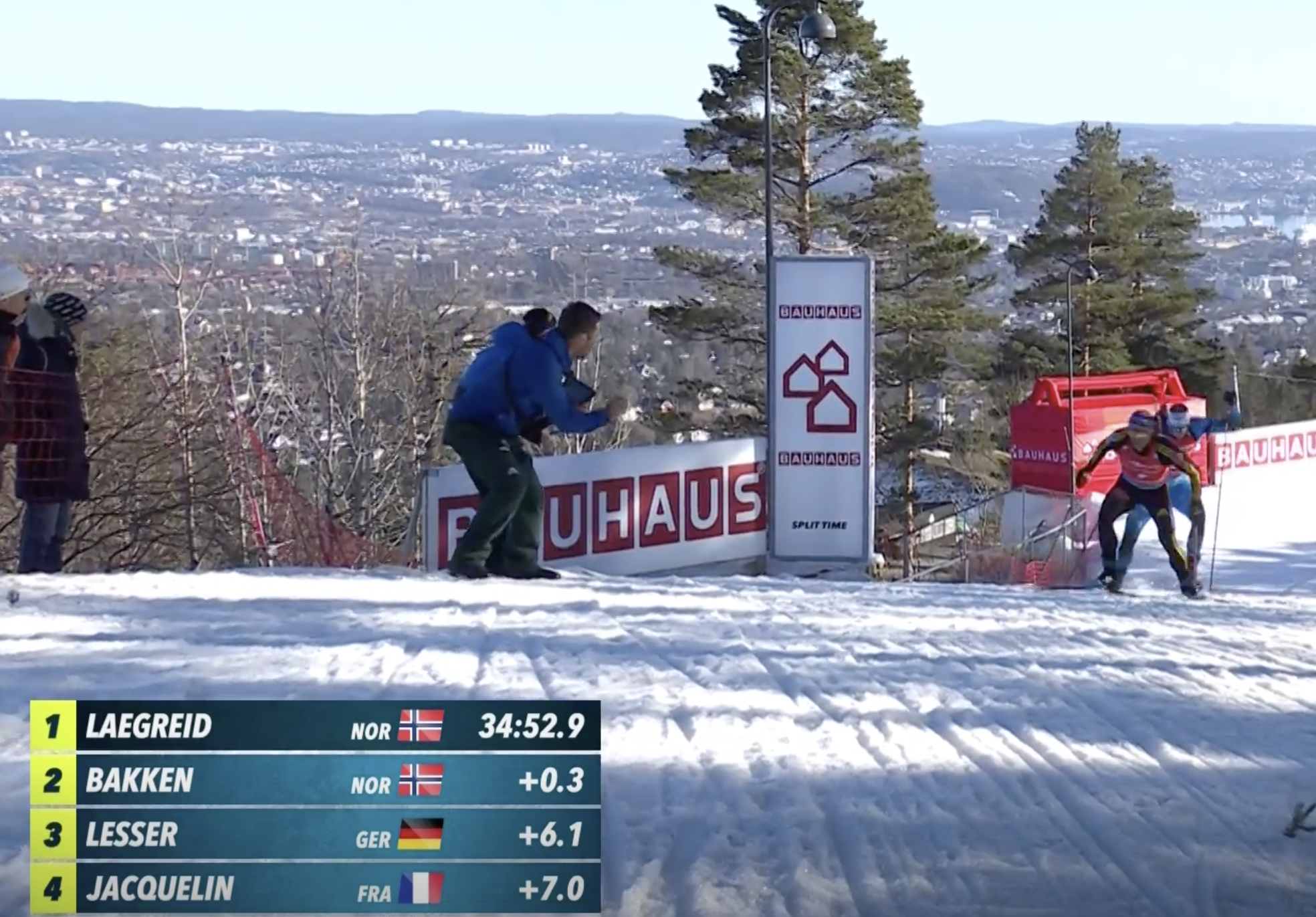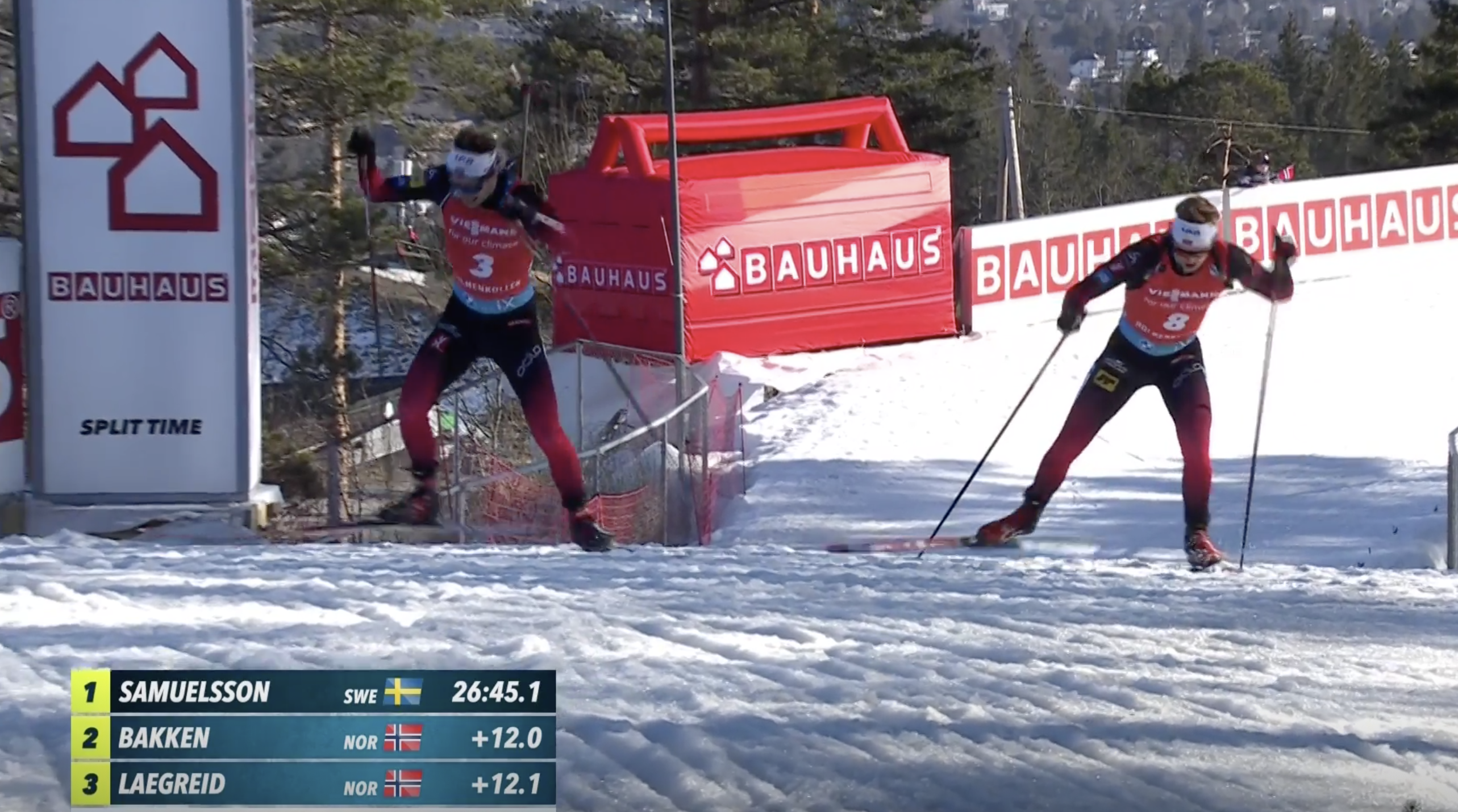 Сокращают отставание от шведа норвежцы — за 800 метров после предыдущей контрольной отметки у Самуэльссона осталось всего шесть секунд!