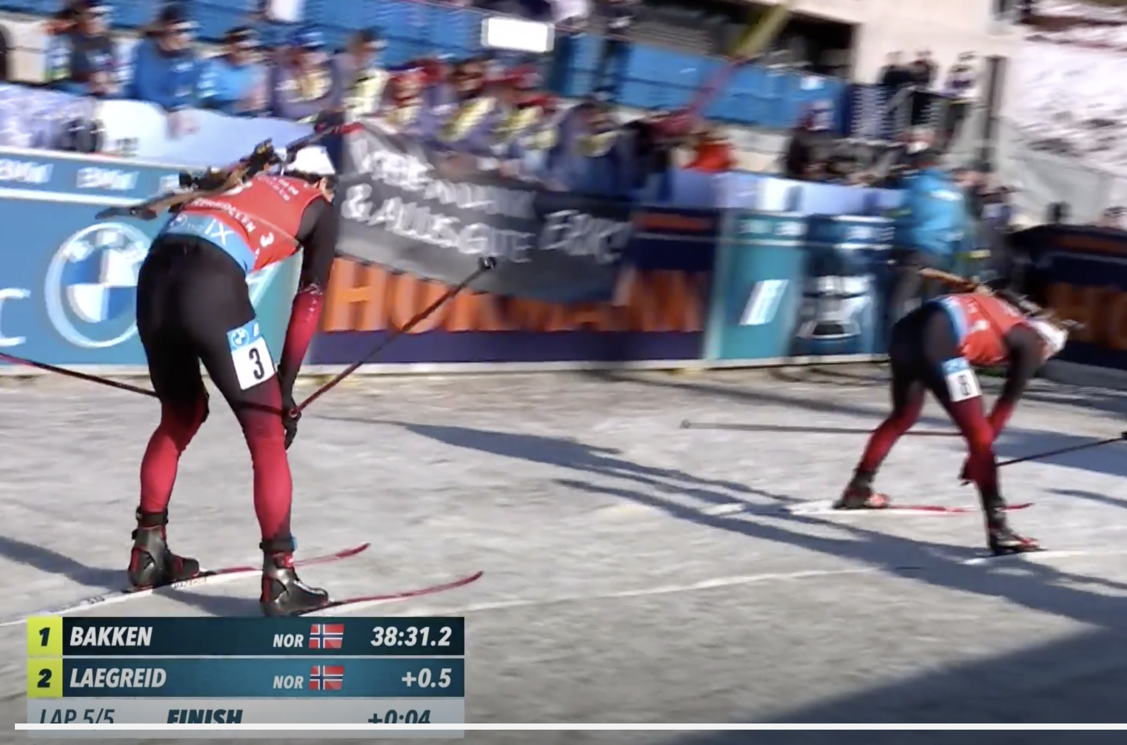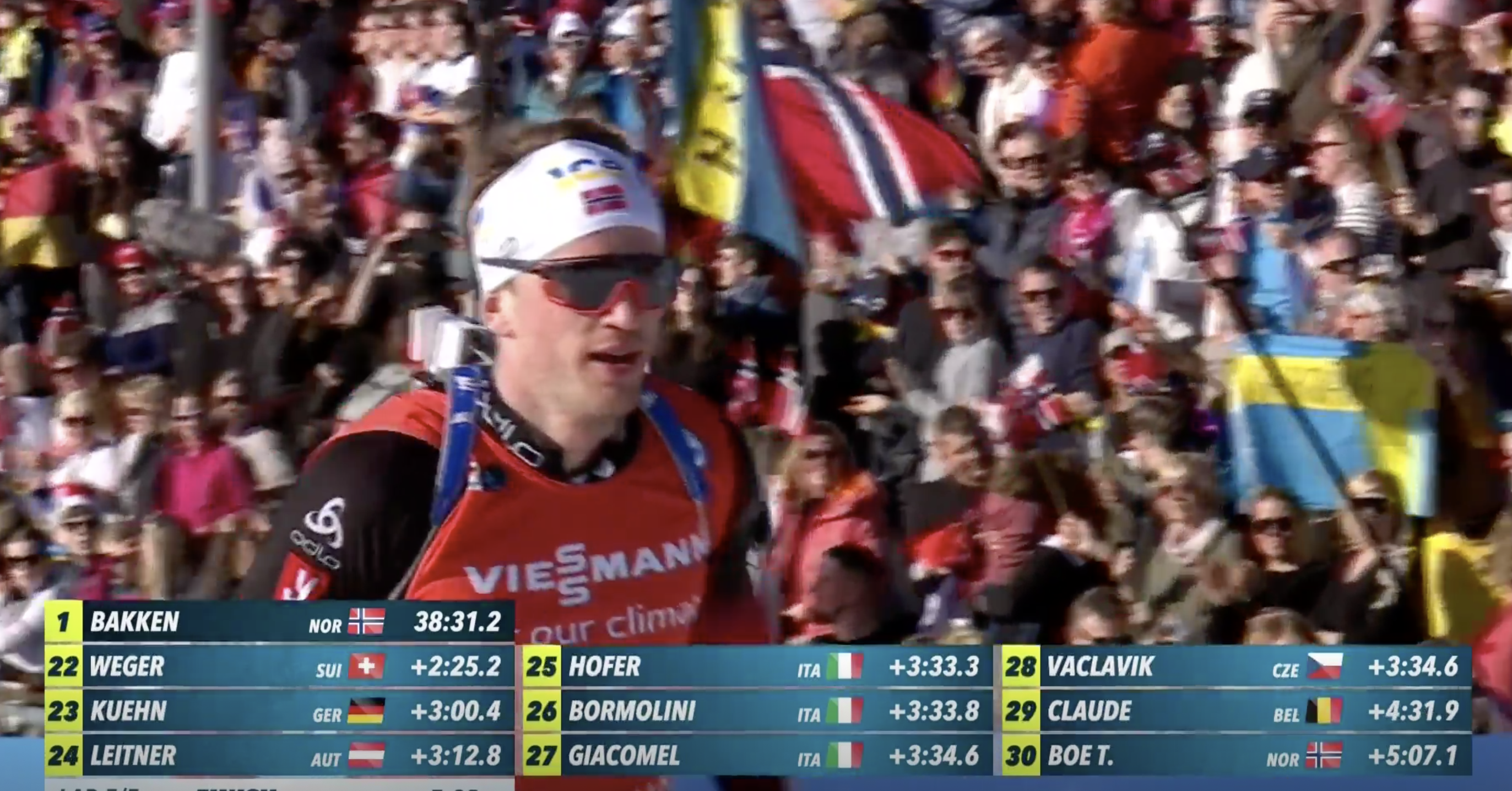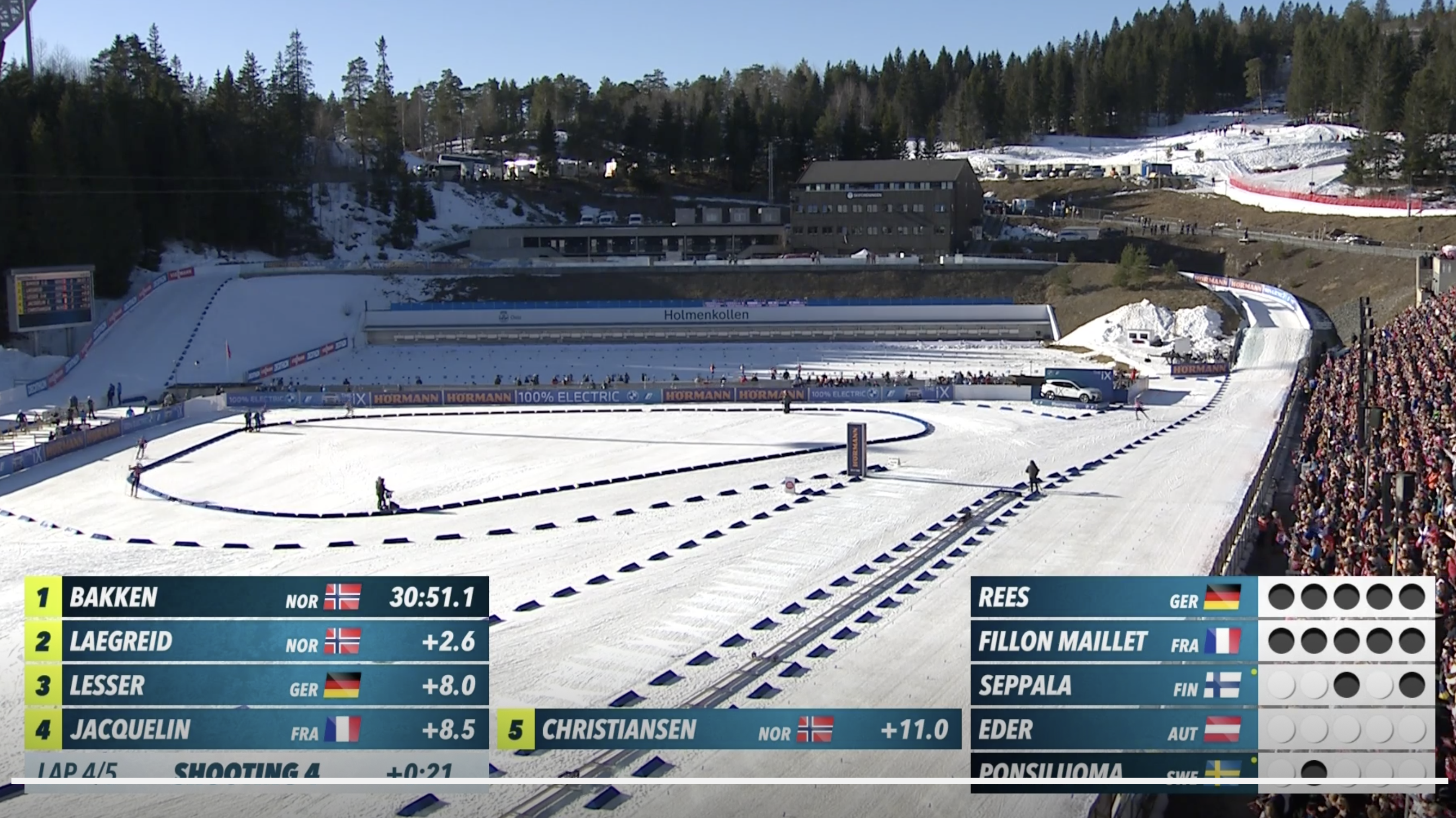 Лагрейд, которой стрелял параллельно с Самуэльссоном, допустил один промах, но уже вырвался в лидеры! Баккен следует сразу же за ним!
