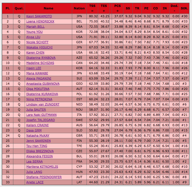 Итоги короткой программы женщин. 24 лучших фигуристки отобрались в произвольную программу.