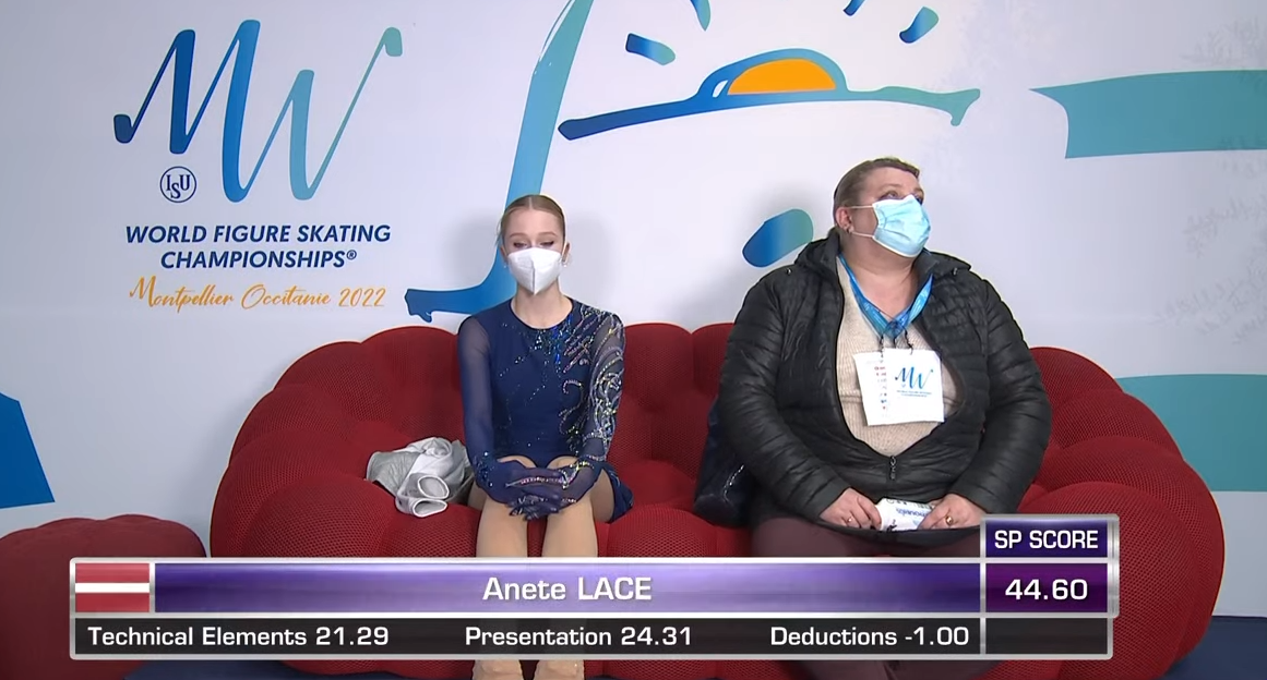 Следующей выступает Анете Ласе из Латвии. Она катается под Can't Help Falling In Love в исполнении женского вокала (Tommee Profitt). Кстати, одним из ее тренеров является россиянин Алексей Урманов.