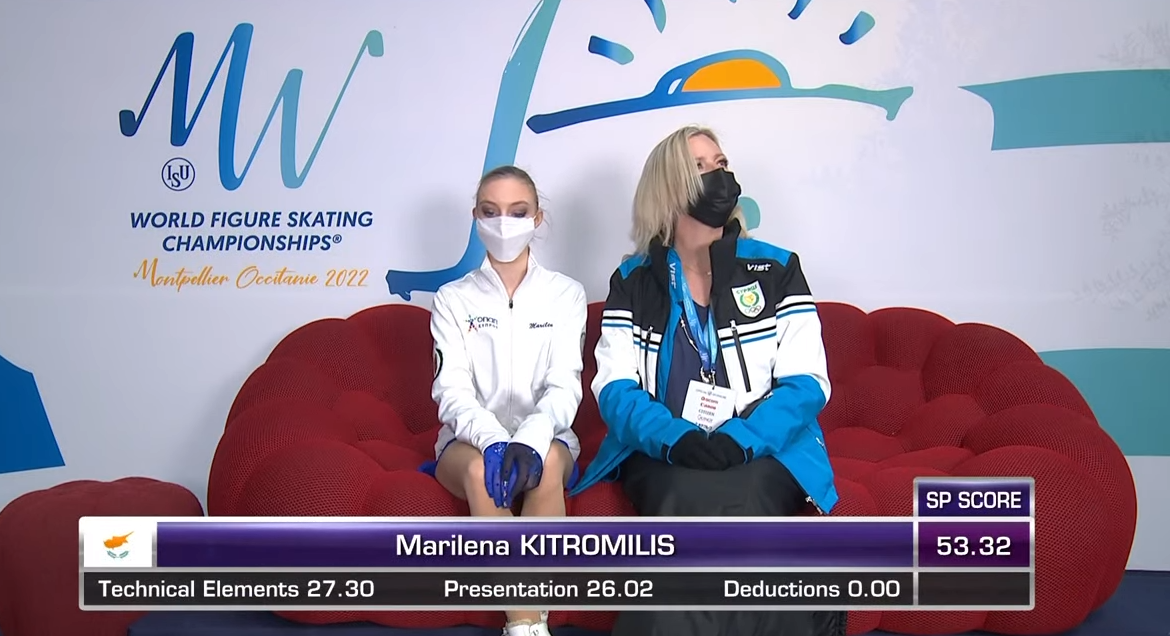 Вау, какое многообещающее начало! Марилена исполнила чистейший двойной аксель, а затем каскад тройной лутц + тройной тулуп! Этот сложный каскад ранее удался на этом турнире только экс-россиянке Губановой. Ай да киприотка!