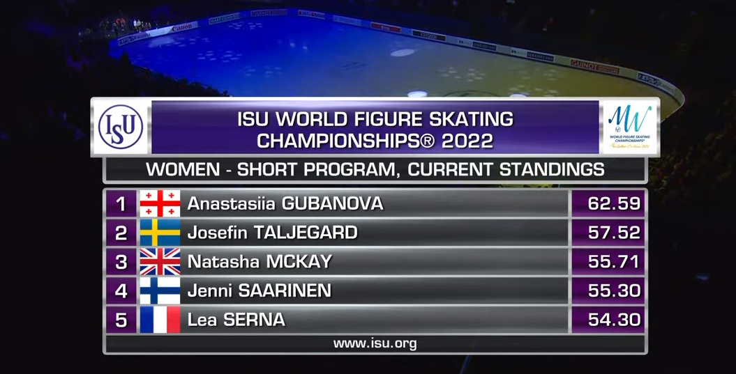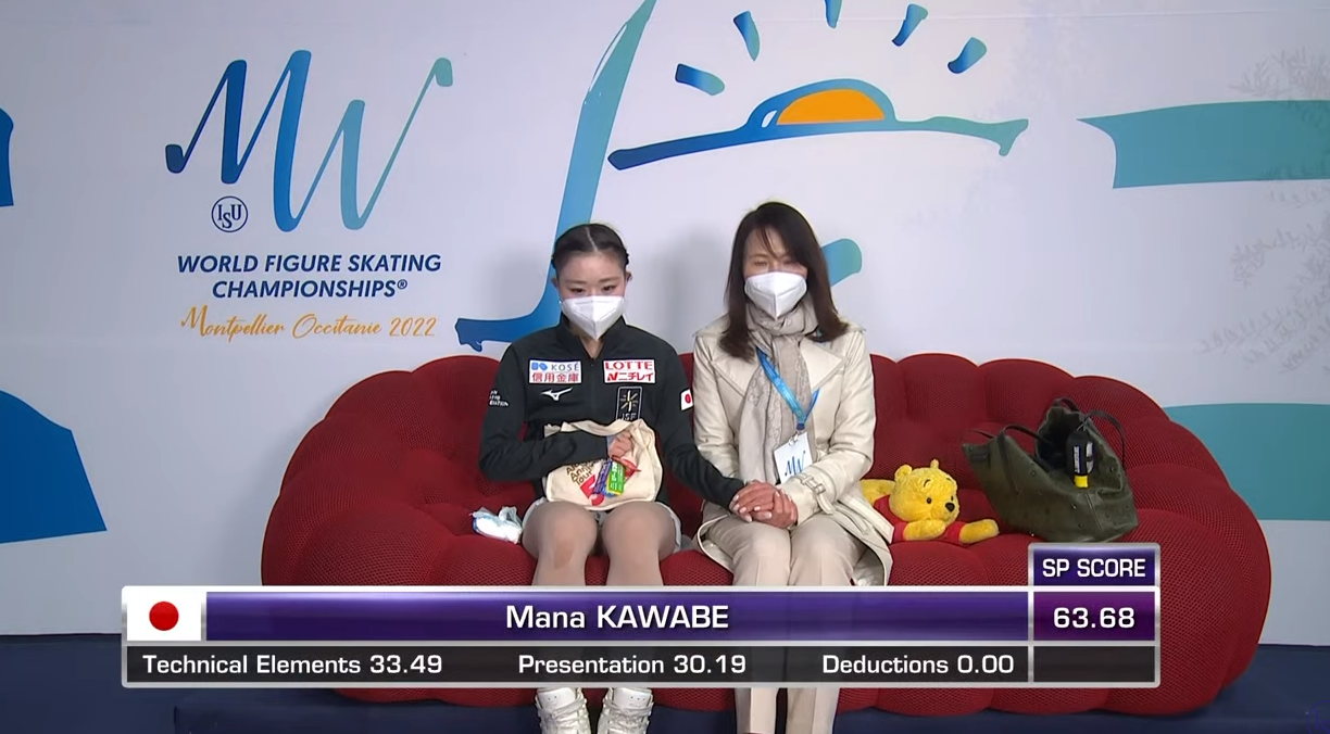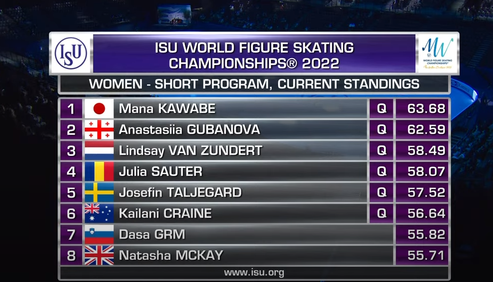 Оценка Кавабе за короткую программу — 63,68 балла. Она превосходит Губанову и поднимается на промежуточное первое место.