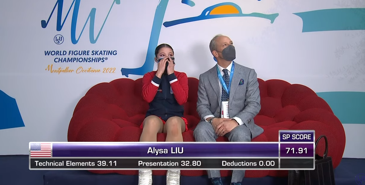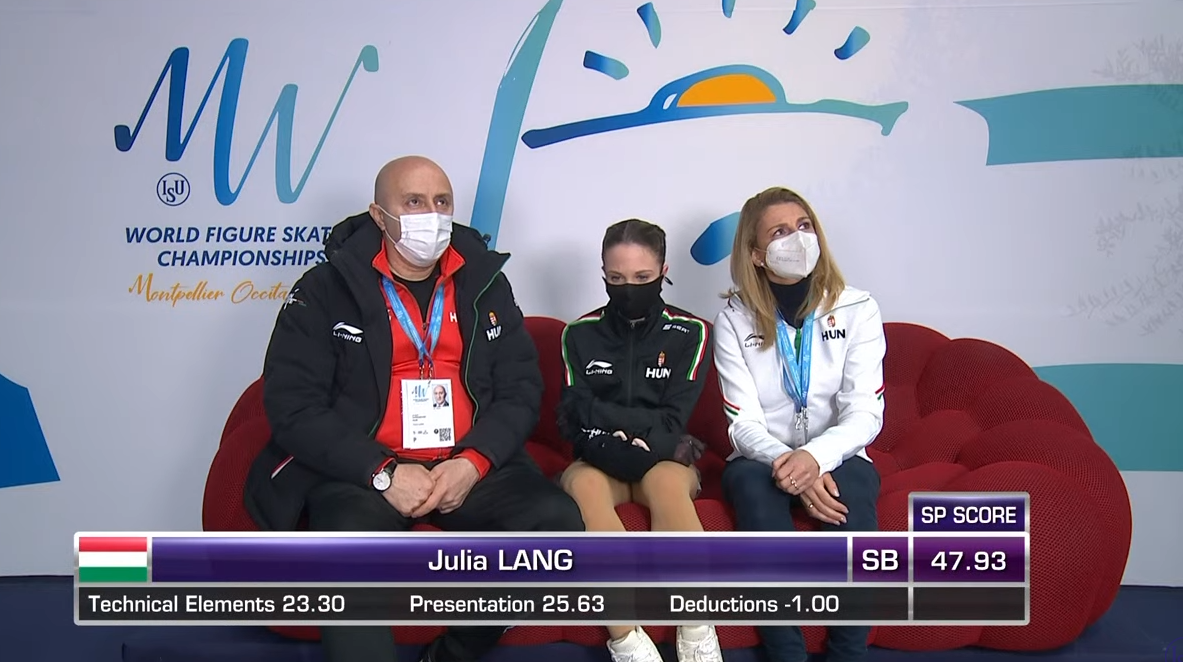 Оценка Ланг за короткую программу — 47,93 балла. В произвольную программу она не попадает и в отчаянии сжимает голову руками.