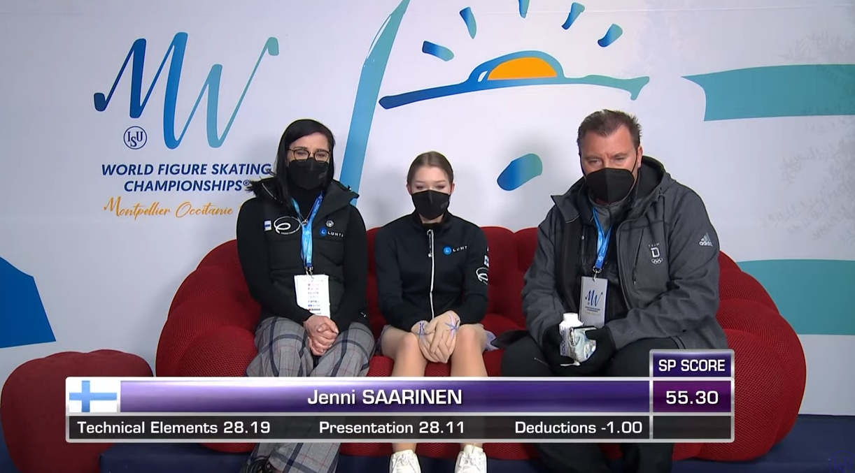 Как обидно! Сааринен почти доделала каскад тройной тулуп + тройной тулуп, но немного недокрутила второй прыжок и присела на колено, за что потеряла больше балла.