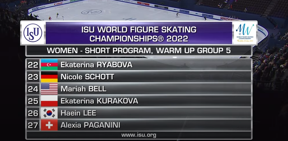 Открывает выступления этой группы Екатерина Рябова — бывшая россиянка, представляющая Азербайджан. Она катается под Mambo Italiano (Bette Middler).