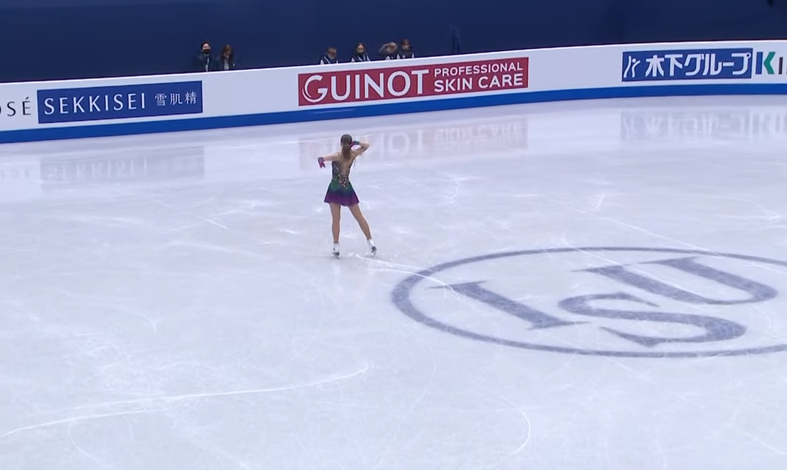 Первая попытка элемента ультра-си сегодня! Вакаба попыталась исполнить тройной аксель, но в итоге так сильно недокрутила его, что получился двойной, да еще и с приземлением на две ноги. Очень мало баллов она получит за этот элемент, но браво за смелость!