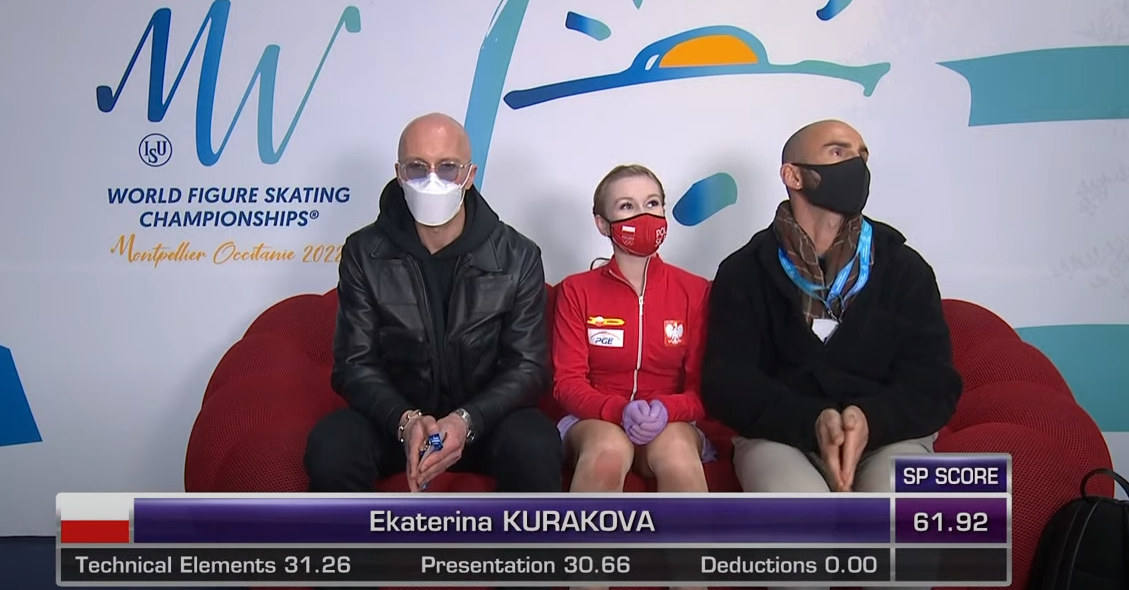 Следующей выступает Екатерина Куракова — бывшая россиянка, выступающая за Польшу. Она катается под «Сентиментальный вальс» Петра Чайковского.