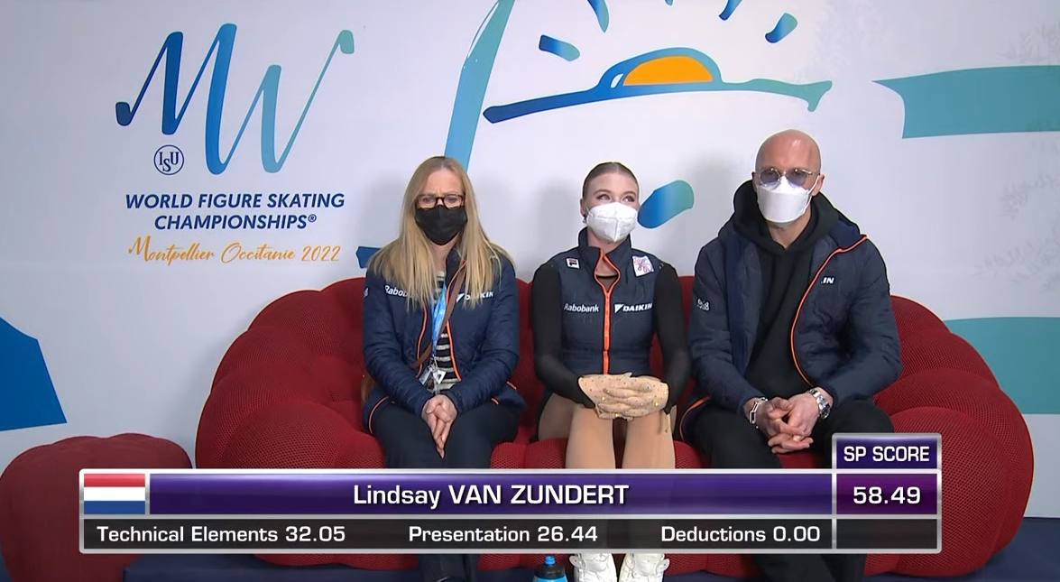 Ван Зундерт показала очень стильный прокат в образе роковой красотки и удержала выражение превосходства на своем лице до самого конца. Дорожка шагов — на третий уровень, вращения — на четвертый. Солидное выступление.