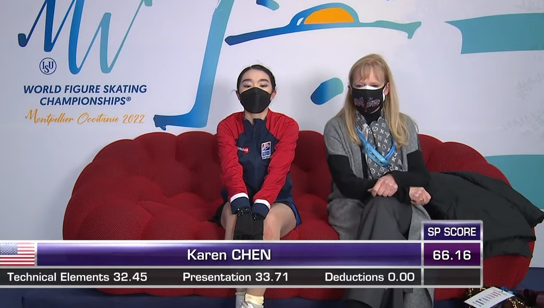 Какая неудача! Неожиданно Карен вместо тройного риттбергера исполняет лишь одинарный. Она ничего не получит за этот элемент — одинарные прыжки запрещены у женщин в короткой программе.