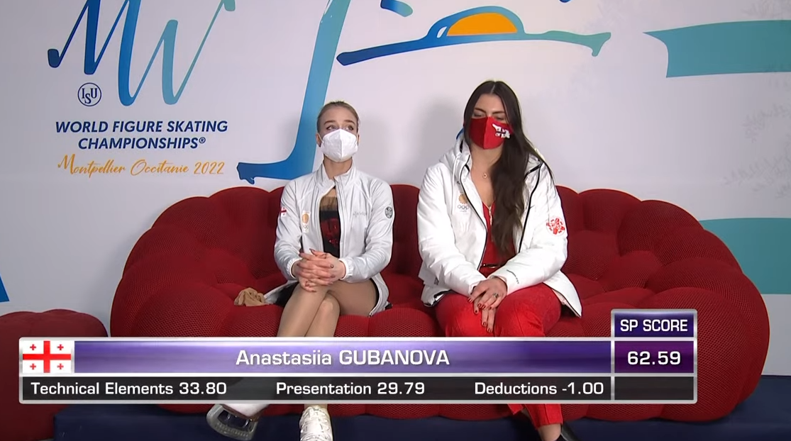 Следующей выступает Анастасия Губанова — бывшая россиянка, которая представляет теперь Грузию. Она катается под французскую композицию Une vie d'amour (Mireille Mathieu).