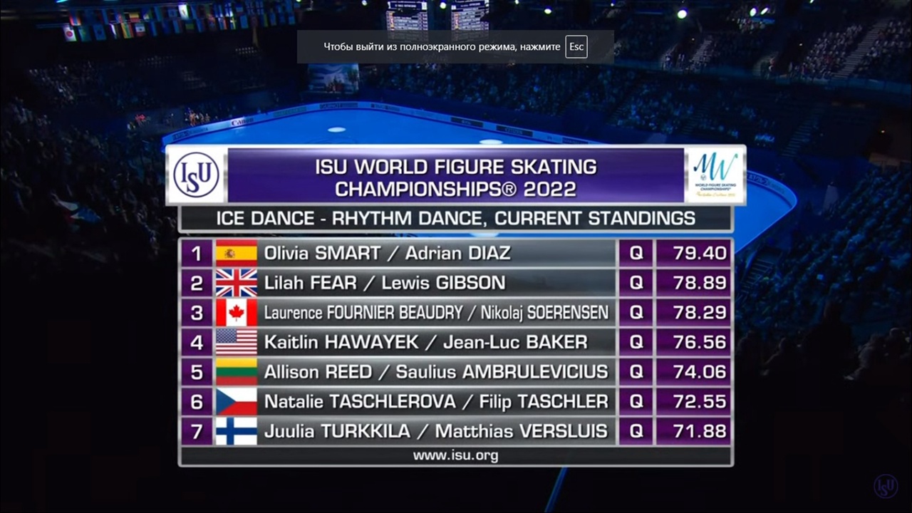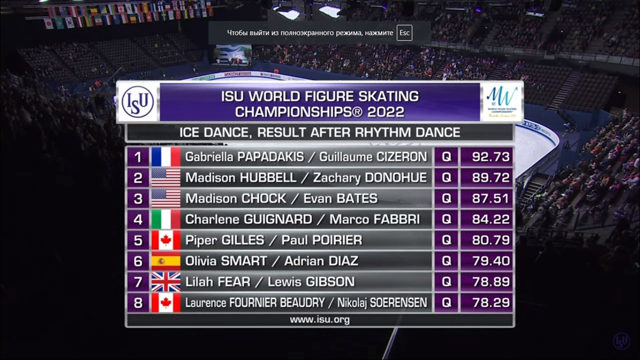 Вот таким получился ритм-танец на чемпионате мира по фигурному катанию, который проходит без сборных России, Белоруссии и Китая. Олимпийские чемпионы Габриэла Пападакис и Гийом Сизерон захватили лидерство с мировым рекордом, но два американских тандема не так уж далеко. А за медали поборются еще как минимум итальянцы. Спасибо, что были с нами и до новых встреч. Трансляцию вел Александр Седов.