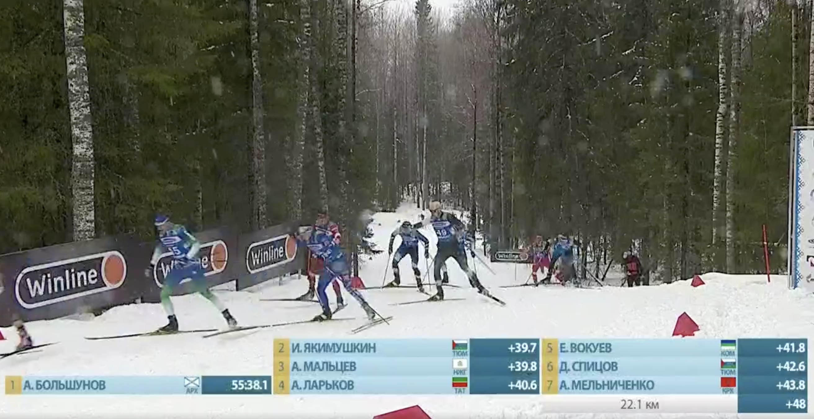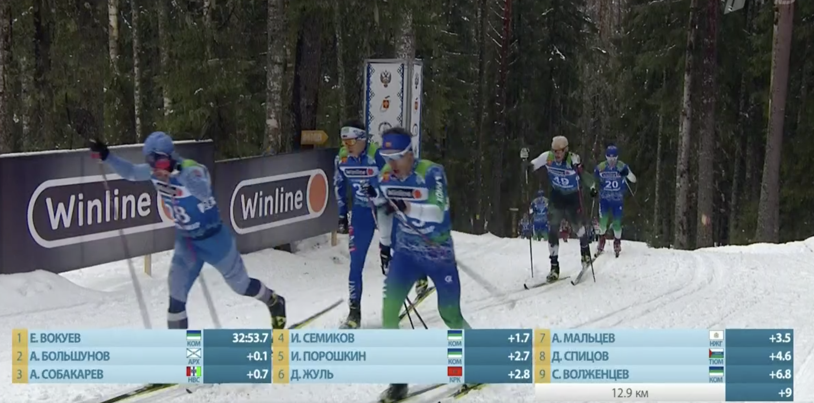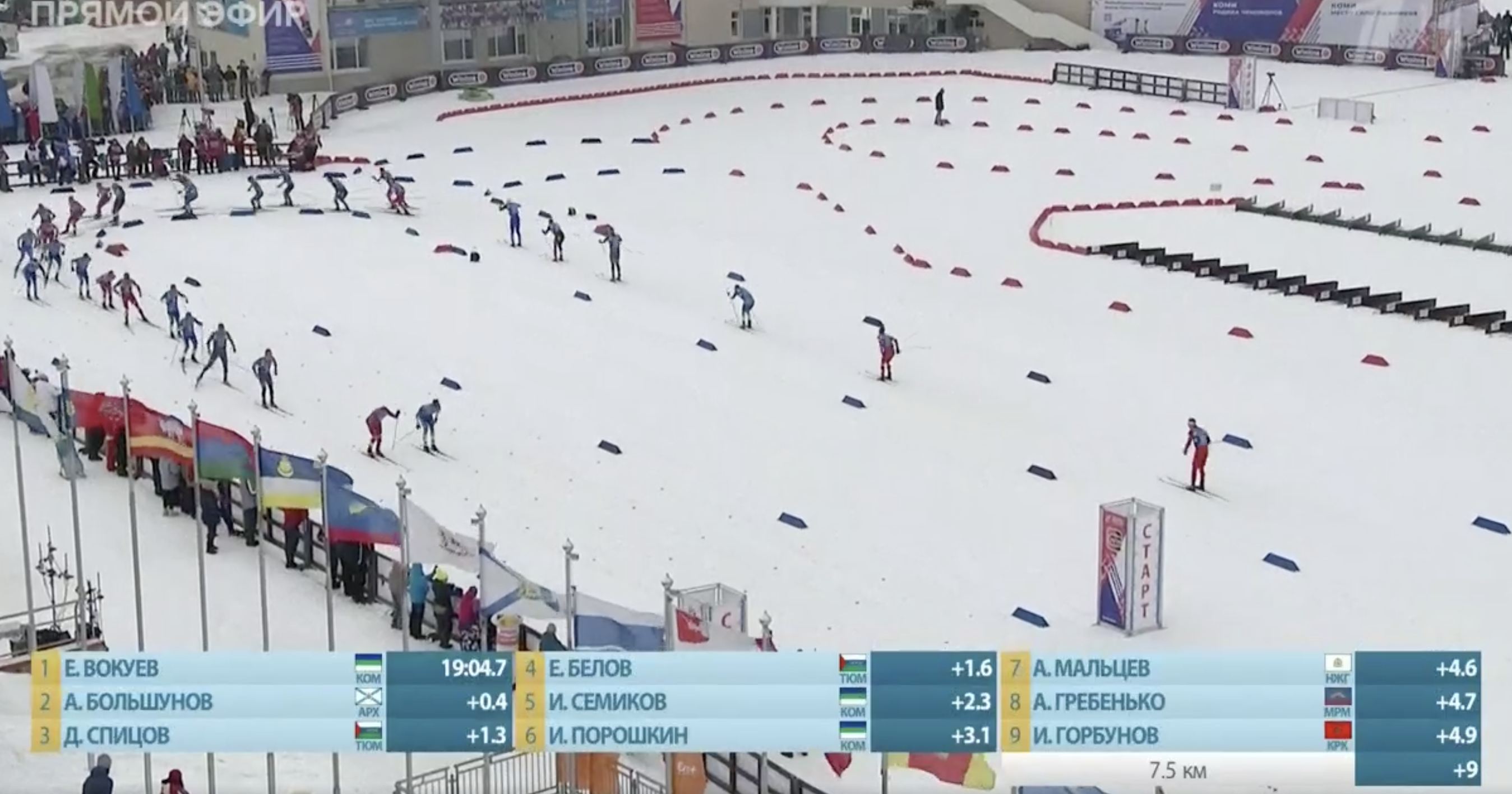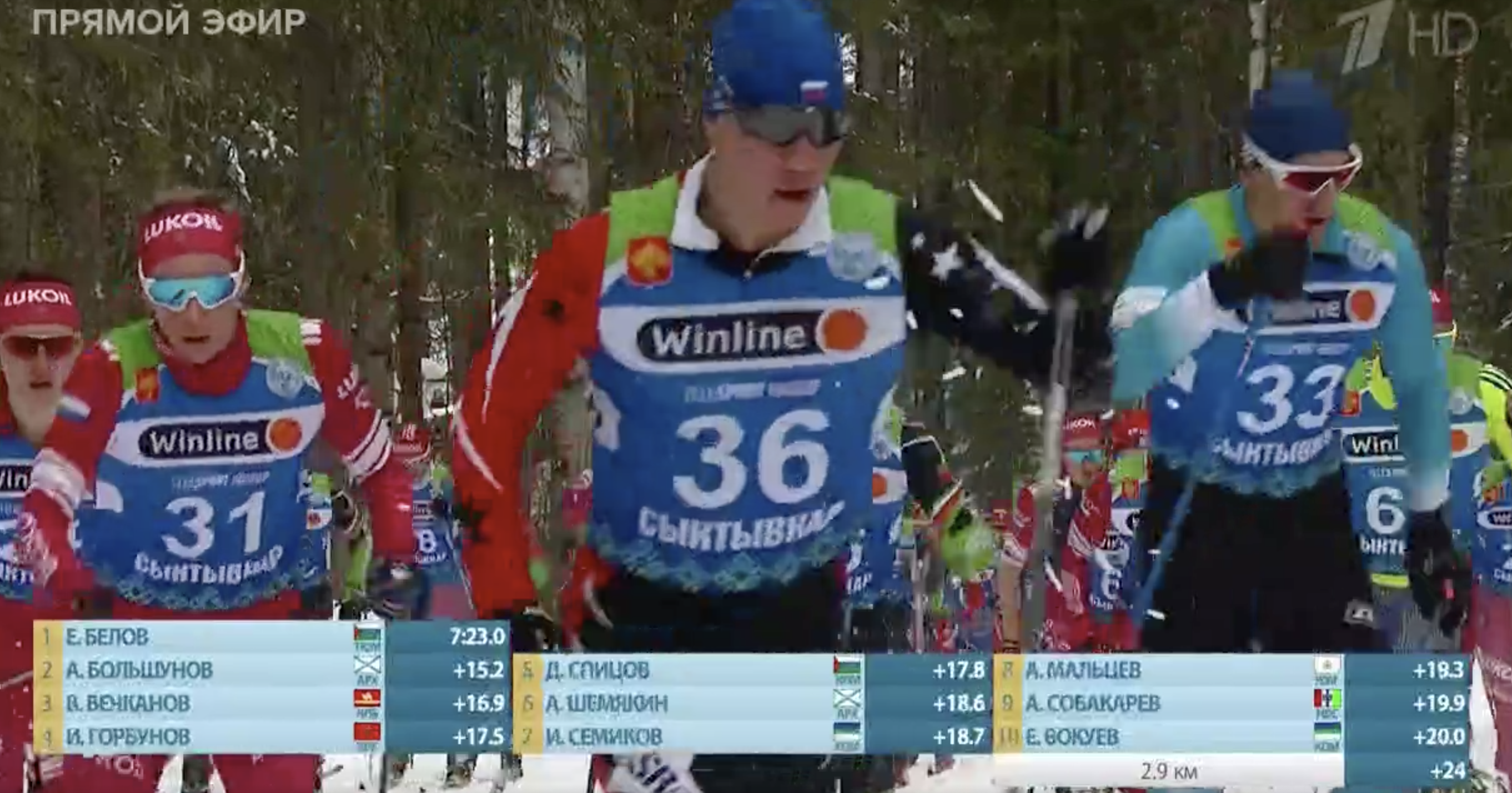 Первый круг позади. Как и ожидалось, Белова нагнала группа преследователей, Большунов выбрался на вторую позицию и отстает буквально на метр от Ермила Вокуева.