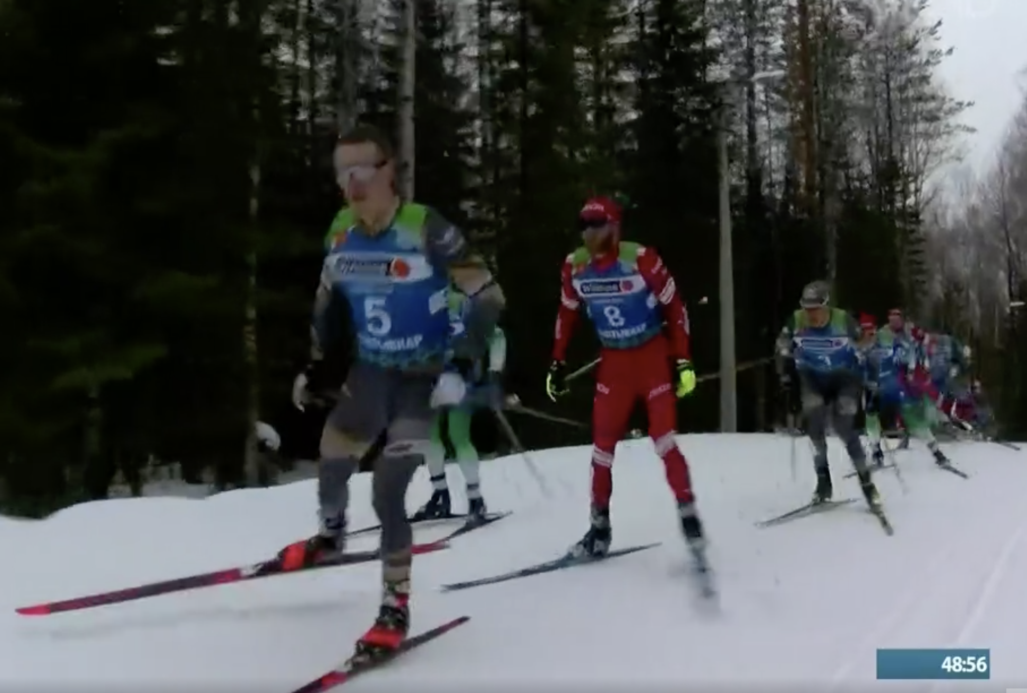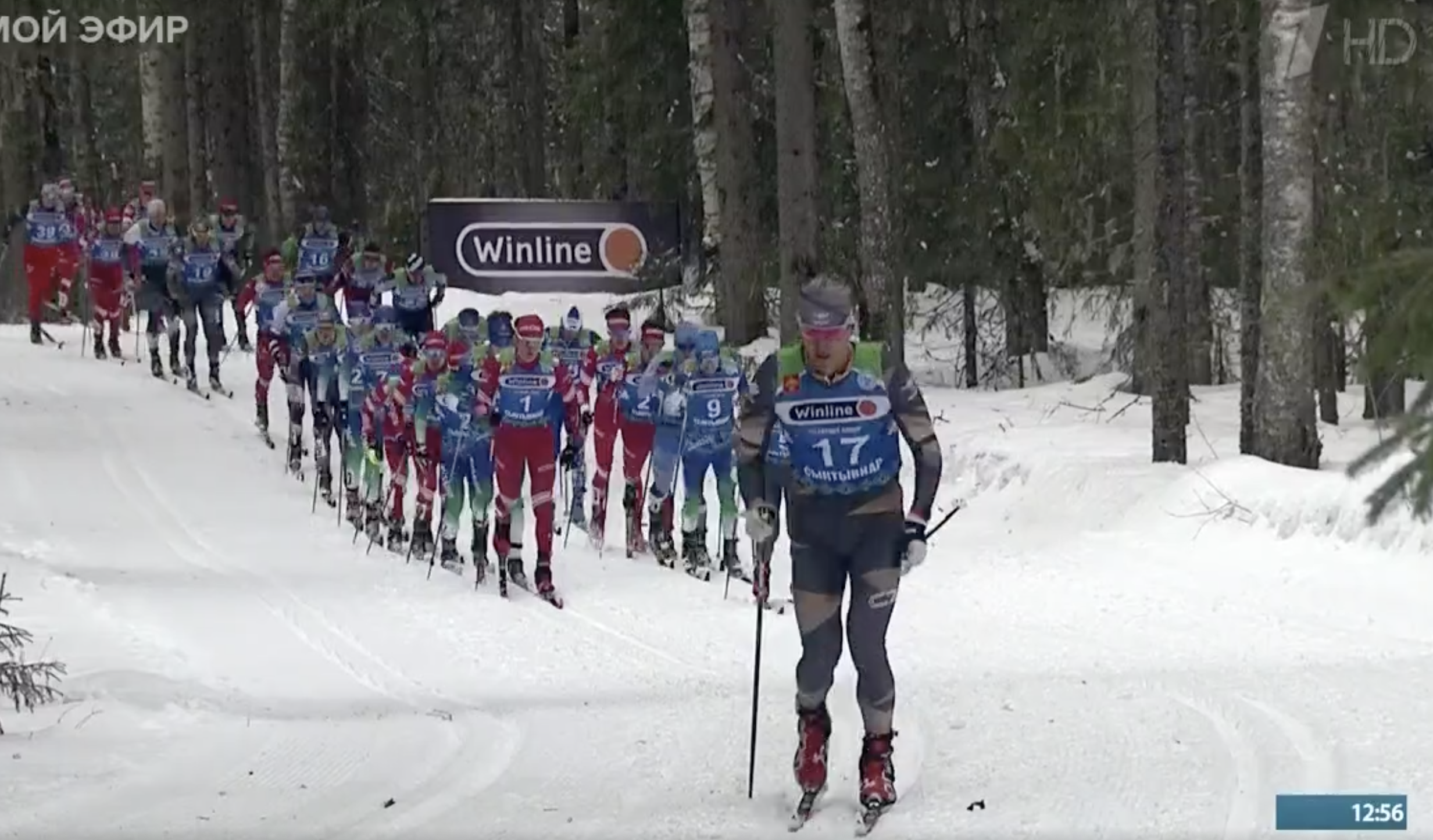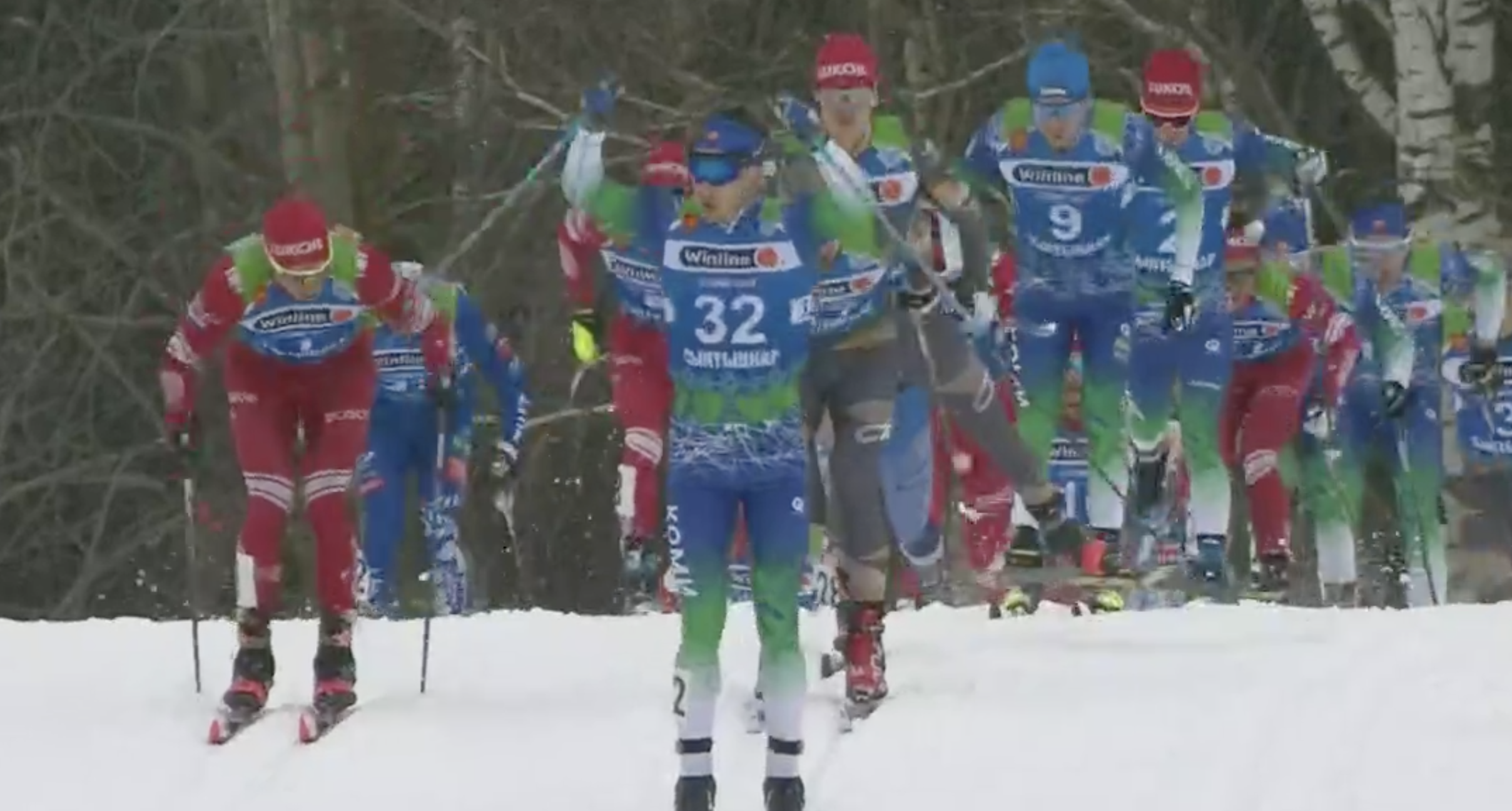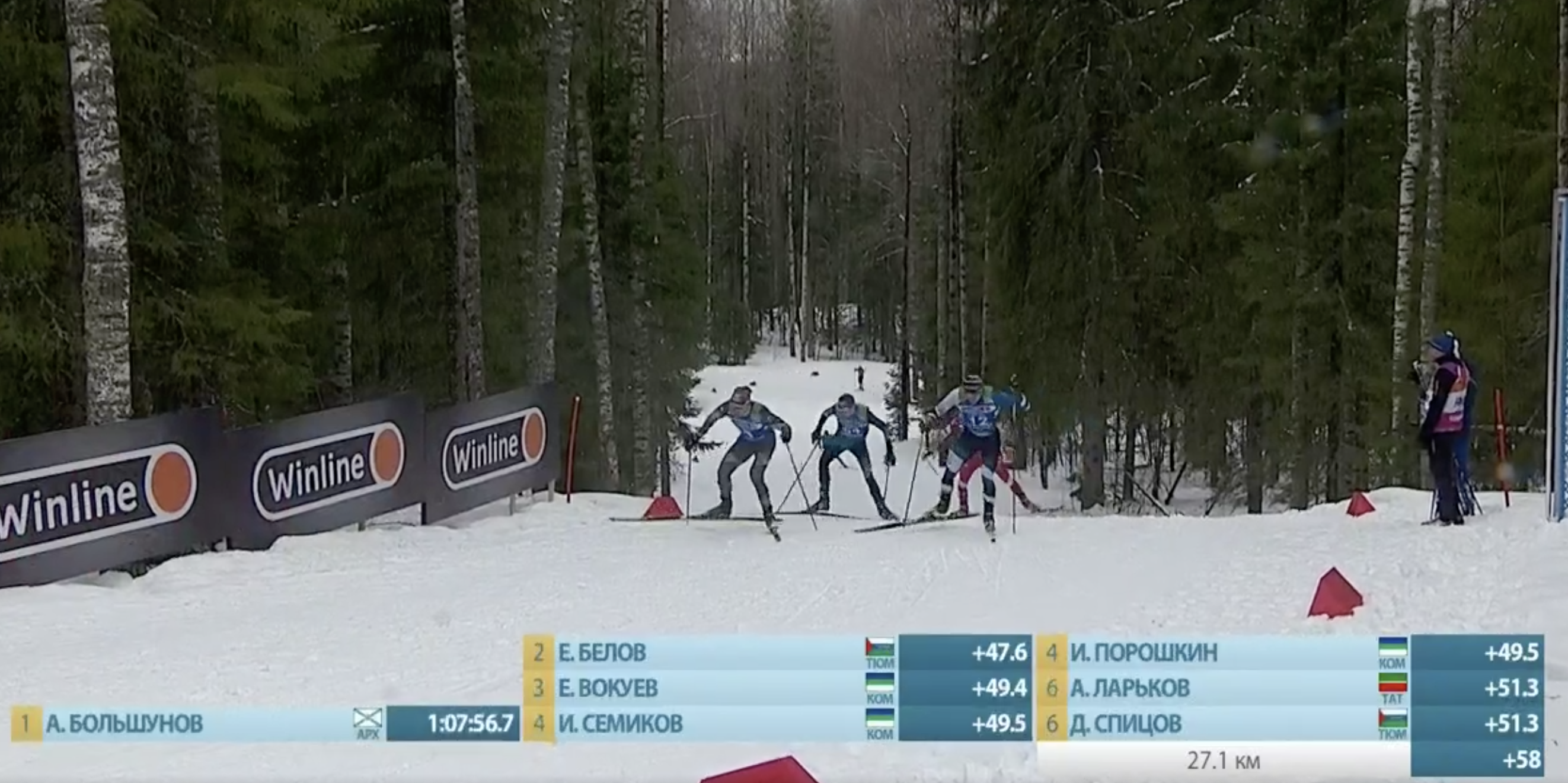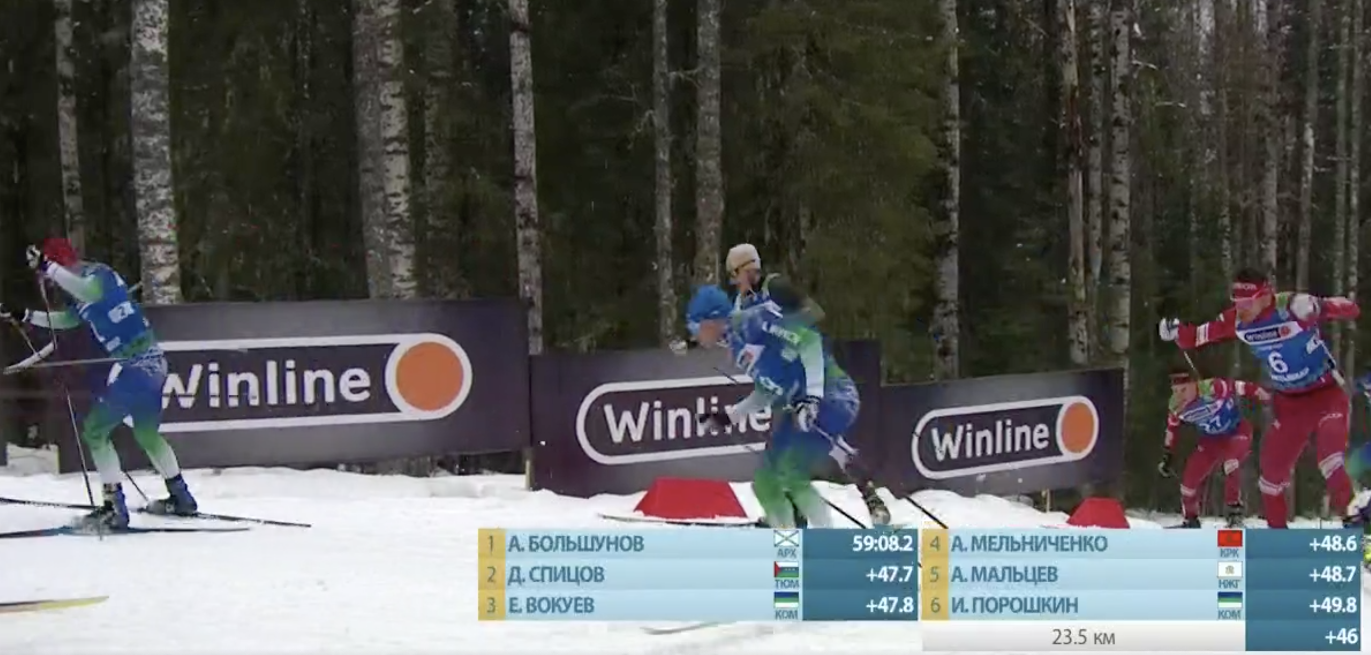 Первый круг позади. Как и ожидалось, Белова нагнала группа преследователей, Большунов выбрался на вторую позицию и отстает буквально на метр от Ермила Вокуева.