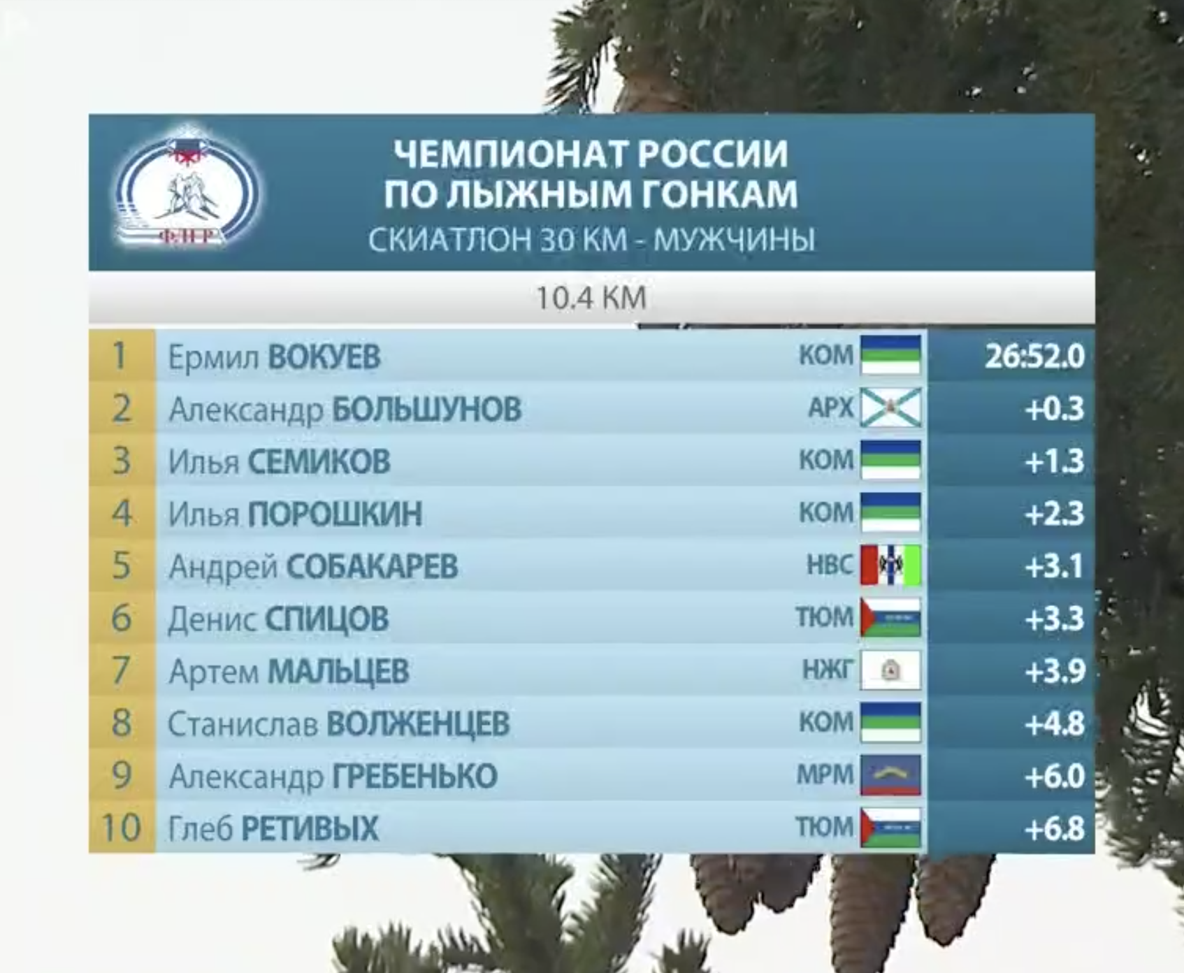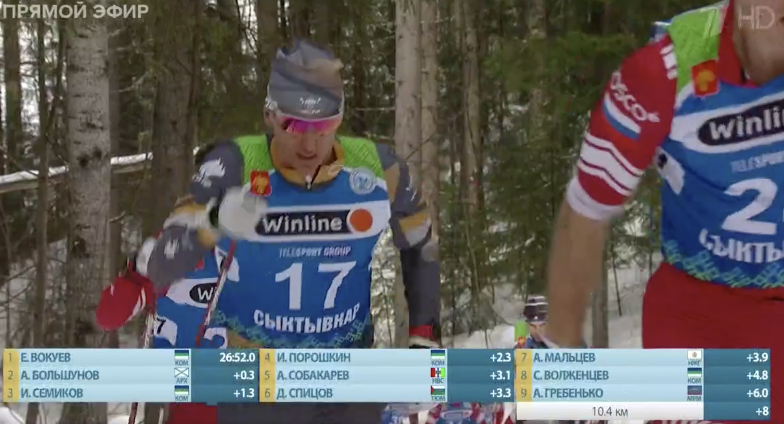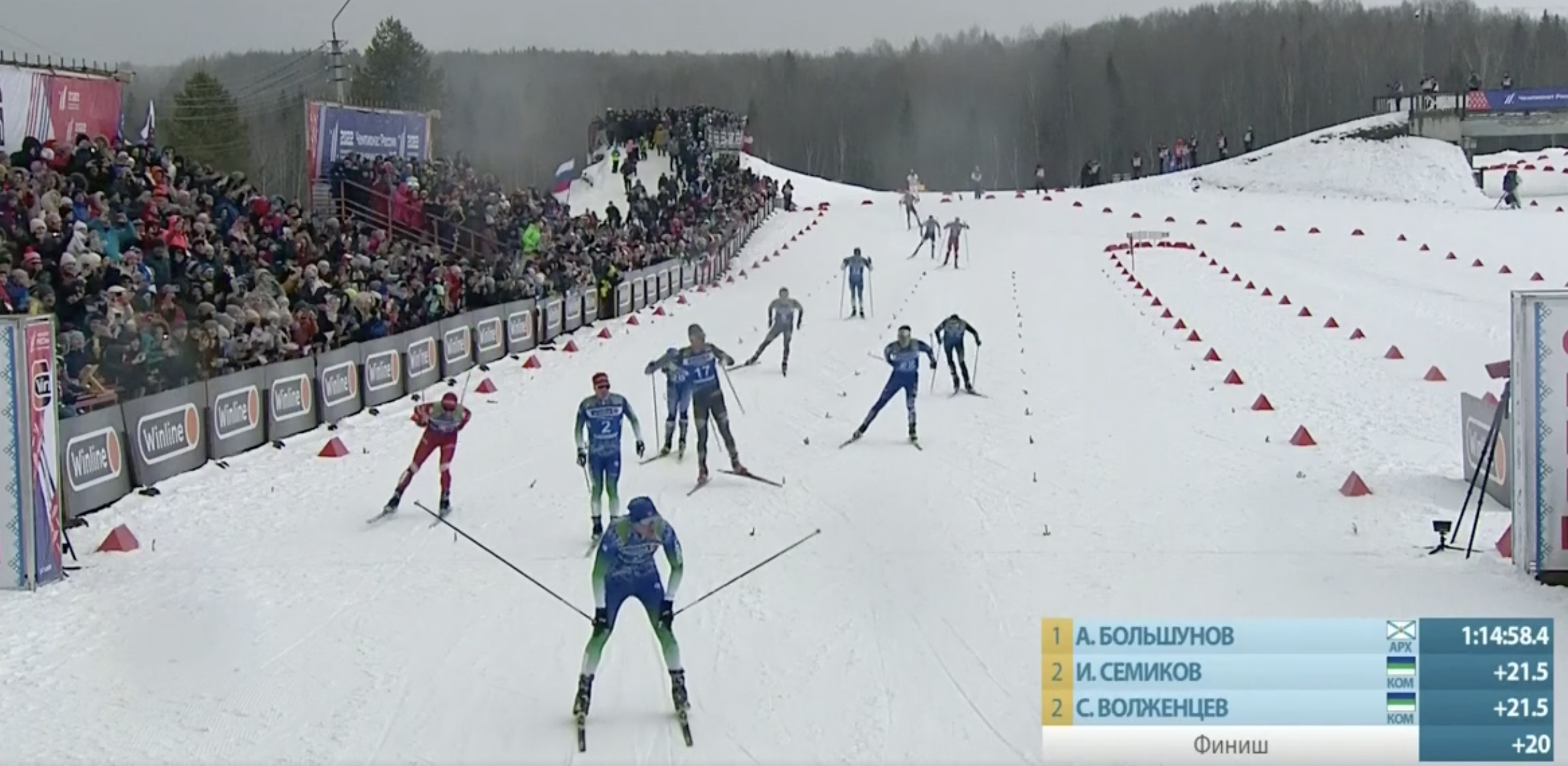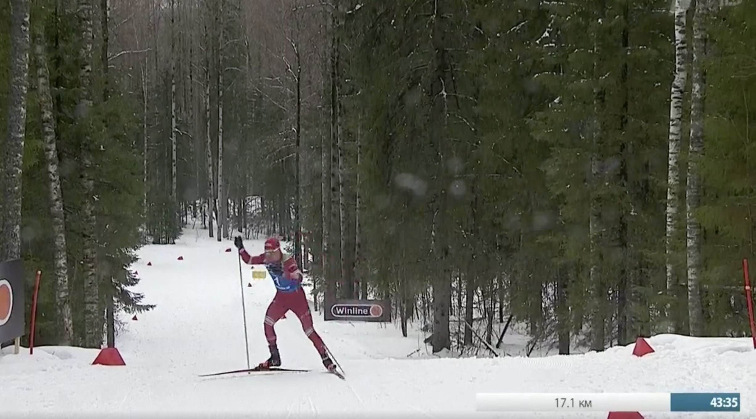 Первый круг позади. Как и ожидалось, Белова нагнала группа преследователей, Большунов выбрался на вторую позицию и отстает буквально на метр от Ермила Вокуева.