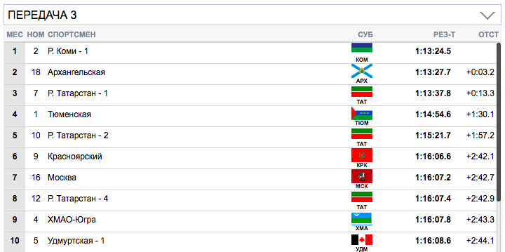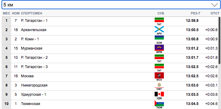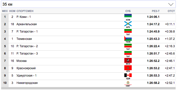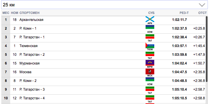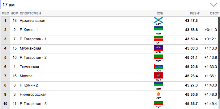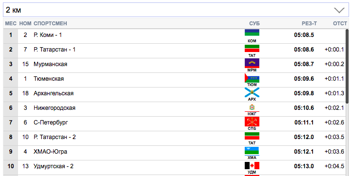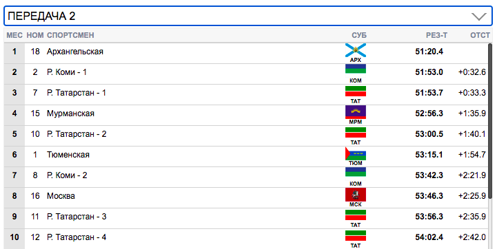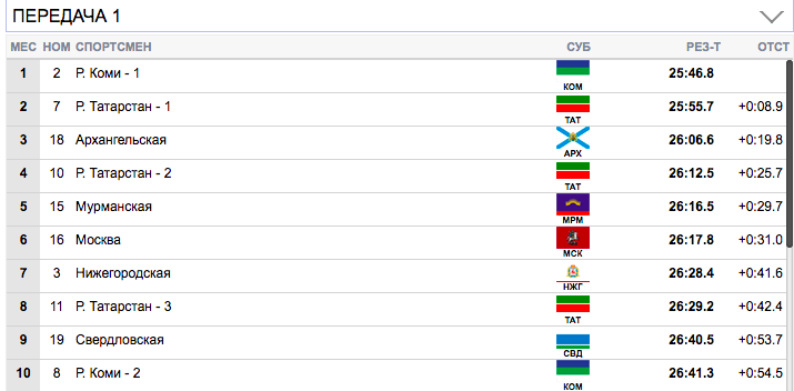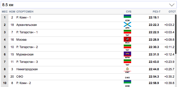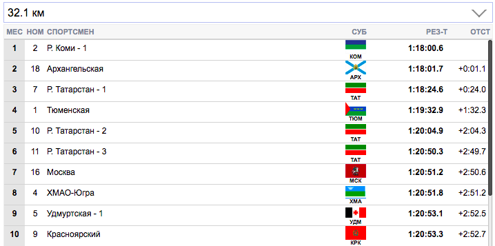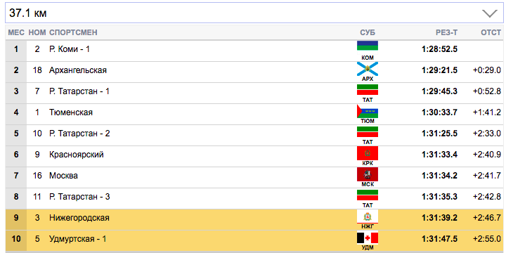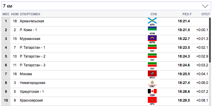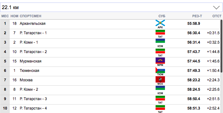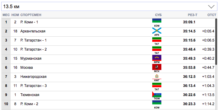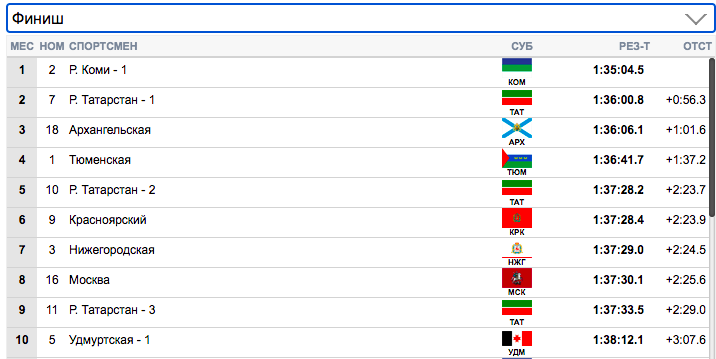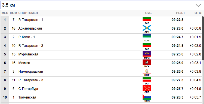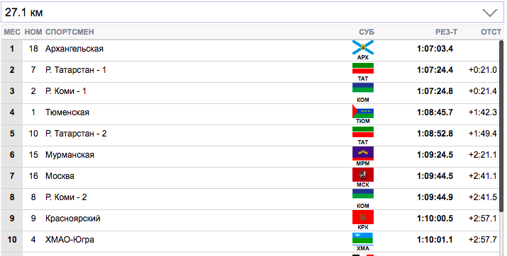 7 км. Терентьев (Архангельская область) занял первую строчку), Семиков (Коми-1) формально второй, но идет фактически вровень с Терентьевым. Гребенько (Мурманская область) — третий. Ретивых (Тюменская область) опустился аж на 14-ю строчку и отстает от лидеров на 20,9 секунды. Белову будет очень тяжело на втором этапе вытащить команду Тюменской области.