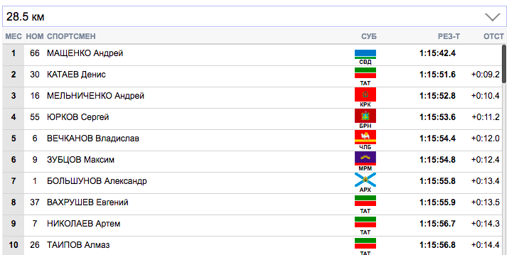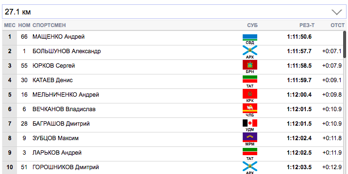10 км. Горошников и Юрков продолжают лидировать. Большунов не отпускает их дальше 11 секунд. В топ-10 три представителя Архангельской области — Горошников (первый), Шемякин (пятый) и Большунов (девятый).