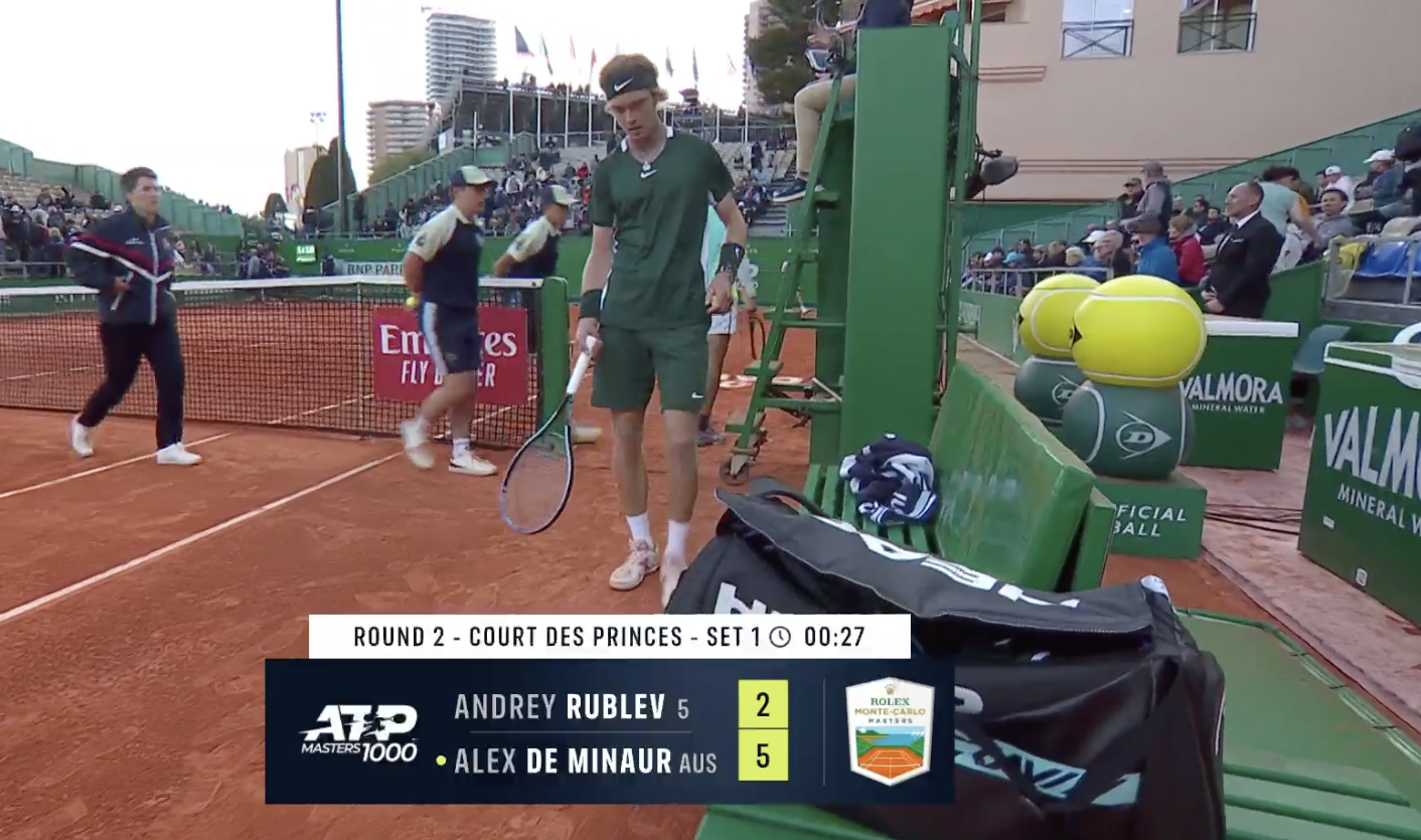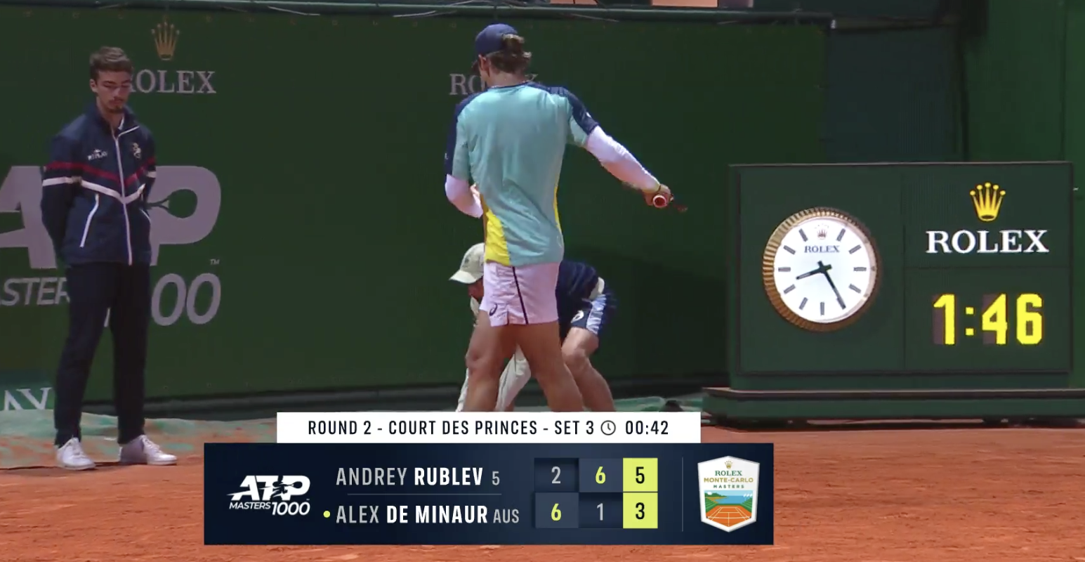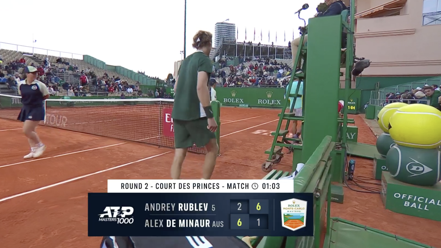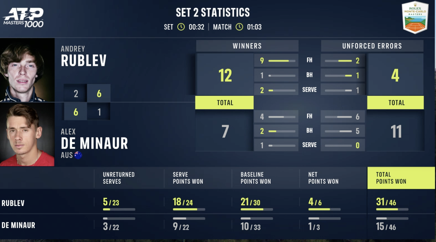 0:30 в пользу Рублева на подаче Де Минаура! Разладилась игра у австралийца, не похож он на себя первосетового.