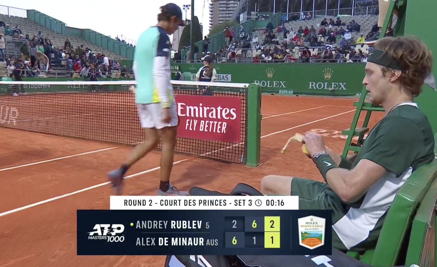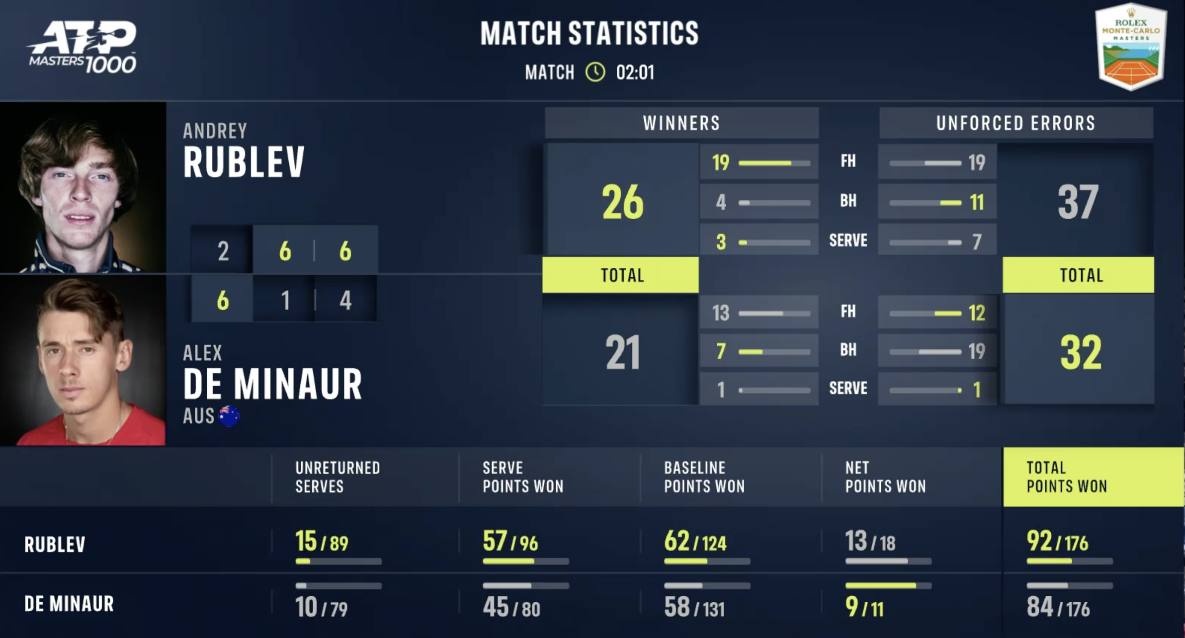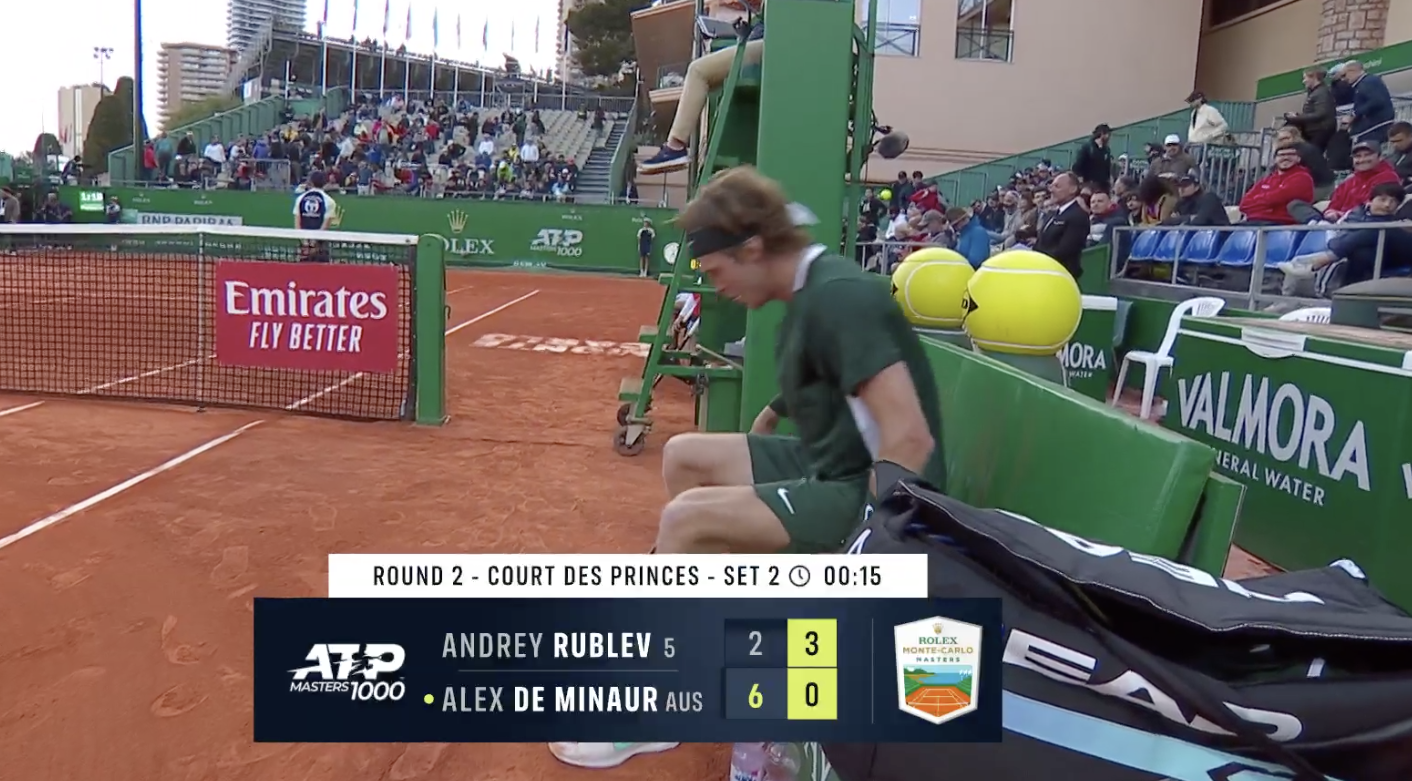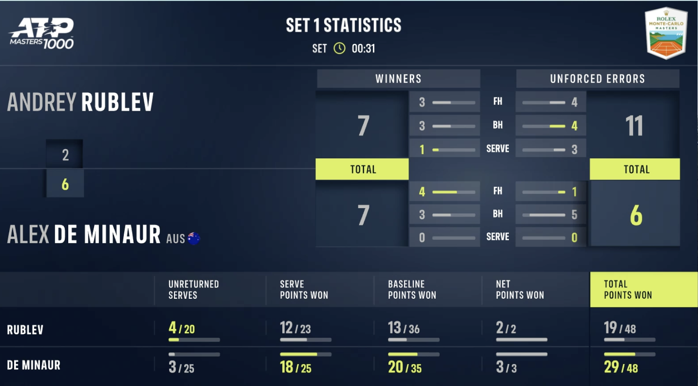 0:30 в пользу Рублева на подаче Де Минаура! Разладилась игра у австралийца, не похож он на себя первосетового.