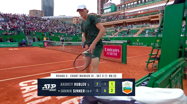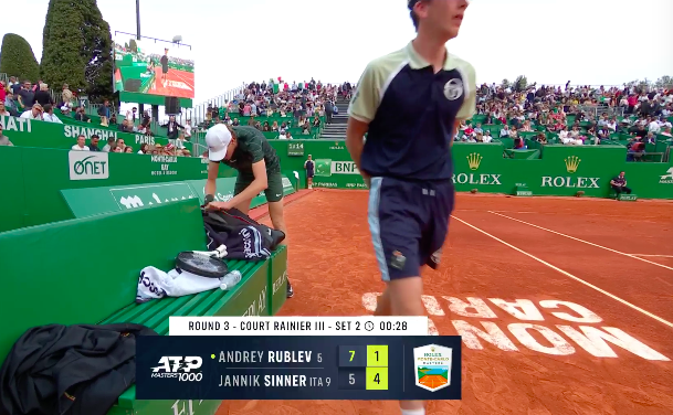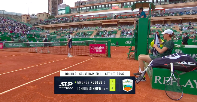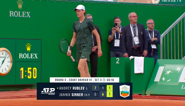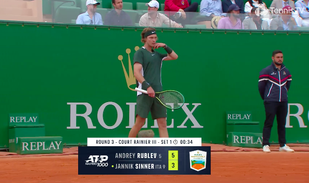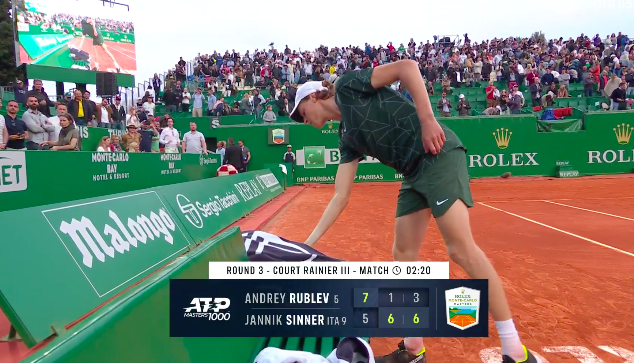 Рублев загонял соперника по разным углам и, казалось, должен взять решающее очко, однако Синнеру повезло — мяч отразился от троса и приземлился в неожиданную для Андрей точку. Ровно. «Vamos, Андрей!» — кричит какая-то испаноязычная фанатка Рублева.