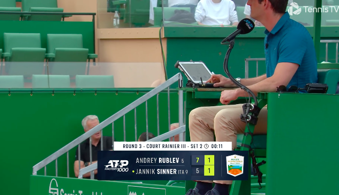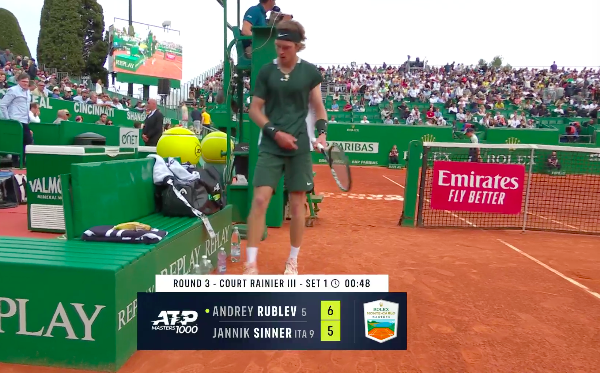 Рублев так мощно принял подачу Синнера, что после ответного удара мяч вылетел далеко в аут. 30:15.