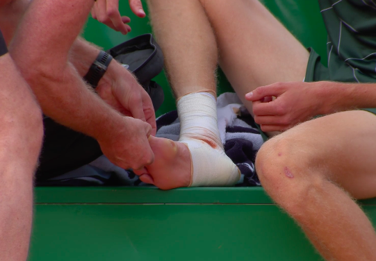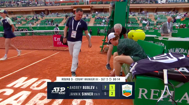Янник попросил медицинский тайм-аут — нужно время, чтобы перебинтовать рану качественно. О снятии речь вроде бы не идет: доктора и сам теннисист улыбаются, все идет по плану.
