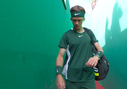 Теннисисты выходят на корт. Рублев пропустил в коридоре Синнера — диктор объявлял того первым. Зрители приветственно кричали «Янник!».
