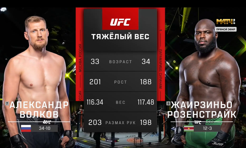 Сразу стоит сказать, что вес бойцов примерно равный, но Волков выше, из-за чего Розенстрайк выглядит чуть мощнее. Начинают бойцы с разведки, никто не бросается сразу в атаку, проверяют друг друга они. Волков прижимает соперника к сетке, а дальше происходит невероятное. Сильнейший удар пропускает Розенстрайк, и Александр идет на добивание, буквально сминает он соперника. Останавливает рефери бой!