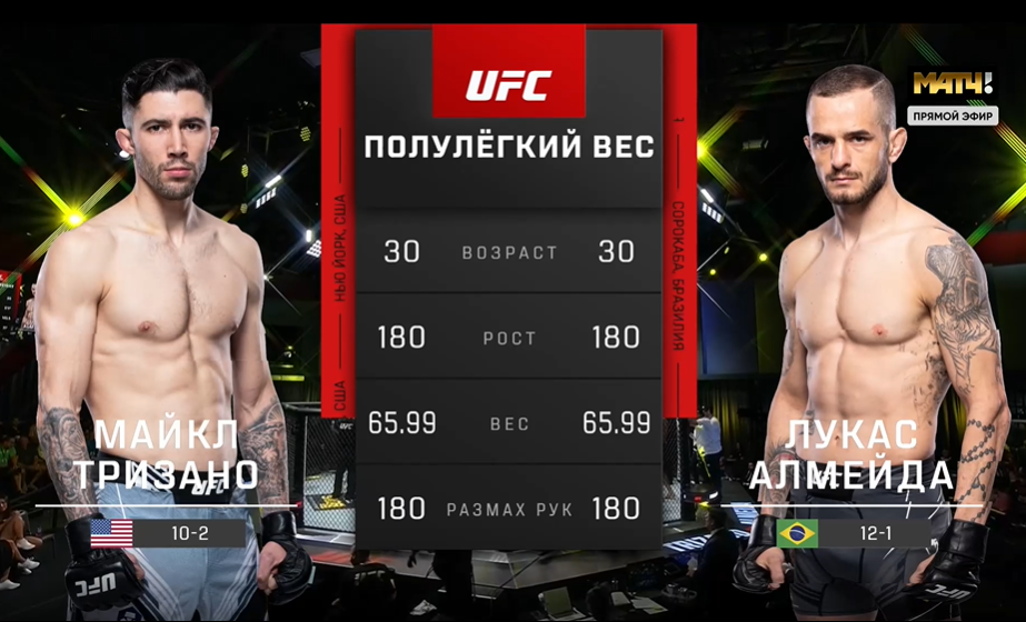 Хорошо Алмейдо начинает напрягать соперника своими финтами, раздергивает соперника. Неплохой левый боковой у него проходит. При этом оба не торопятся. Двойка хорошая сработала у Лукаса. Тризано пока бьет мимо цели, чуть активнее выглядит его соперник. Но решил Тризано заклинчивать, прижимает он Алмейду к сетке. Ударами по бедрами он отрабатывает, но в скором времени разрывается клинч. По животу проходит отличная серия от Лукаса, но Тризано вновь идет на сокращение дистанции. Алмейда быстро выходит из нее, продолжая наносить удары по своему сопернику. Тризано тоже наносит ряд весьма неплохих ударов. По корпусу он пробивает, Алмейда падает после одного из ударов, Тризано идет добивать, но вот замедлился он, сходу не удается. Времени ему не хватило, а ведь могло бы завершиться так же, как и в прошлые три боя.