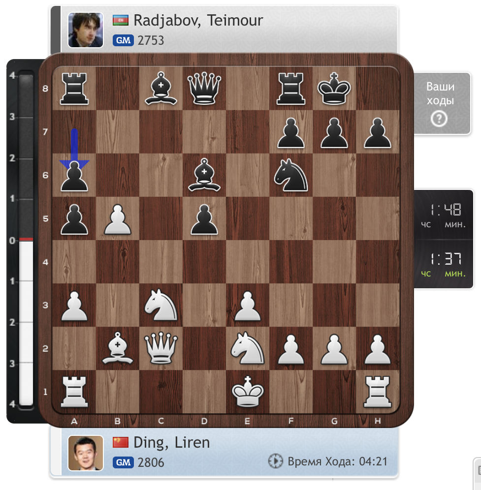Дин играет ферзем на с1. Видимо, не очень-то и хочет китаец бороться с Непомнящим за первое место в турнире.
