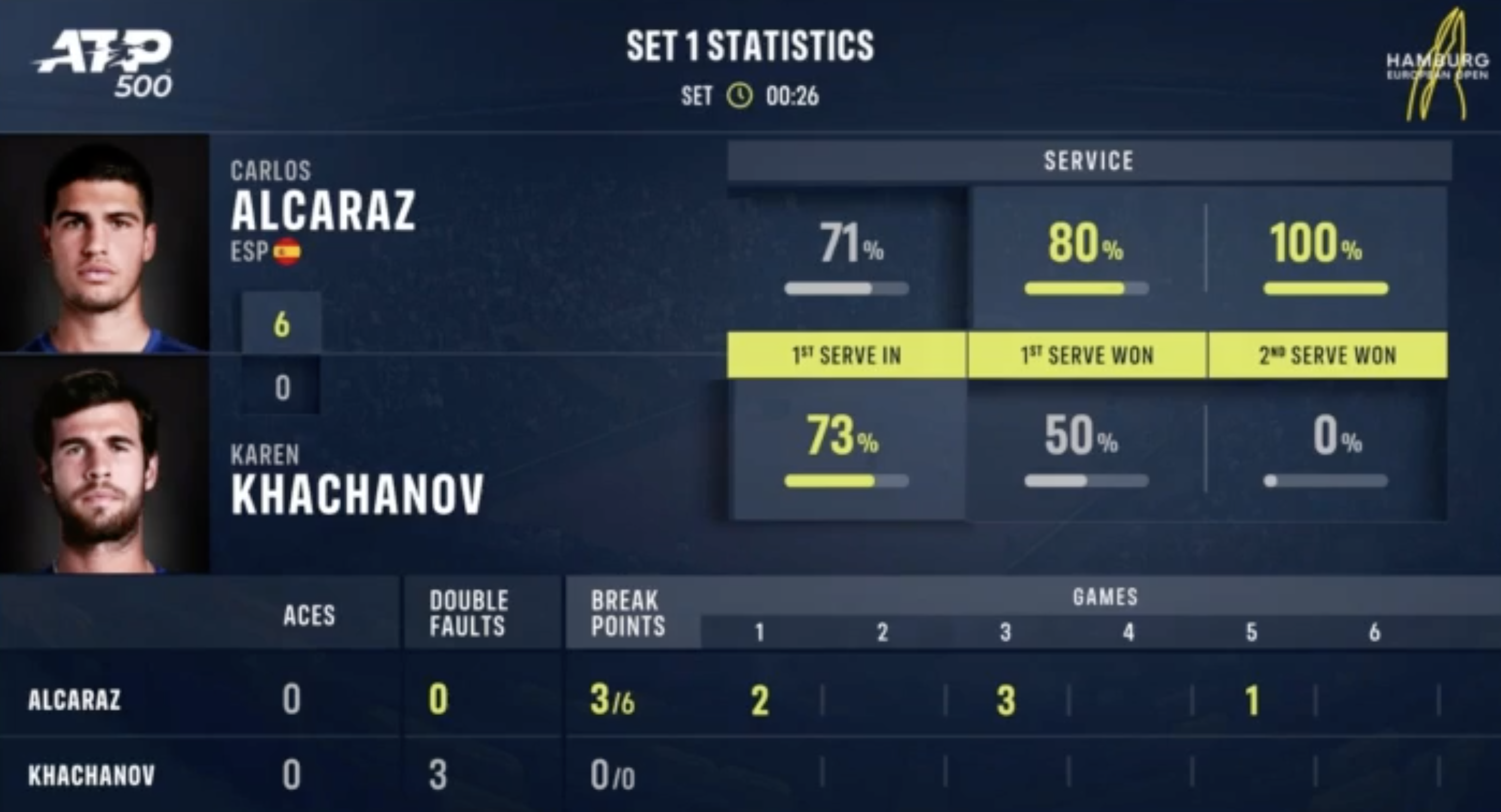 В угол кладет Карен мяч, Алькарас не дотягивается. 30:40. Первый брейк-пойнт у Хачанова в матче.