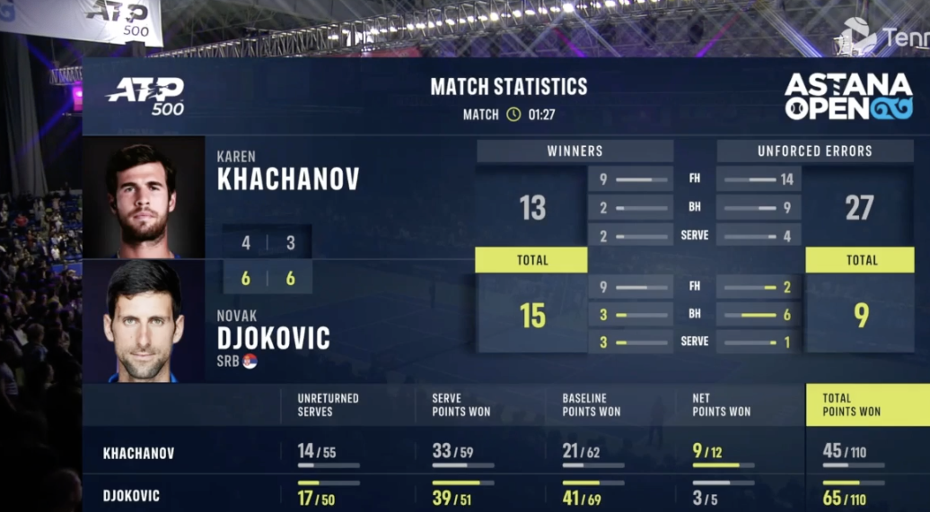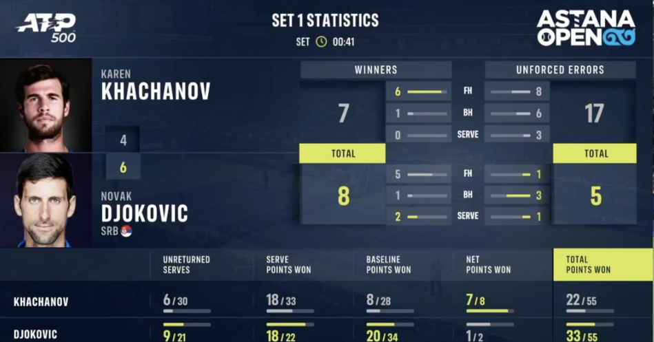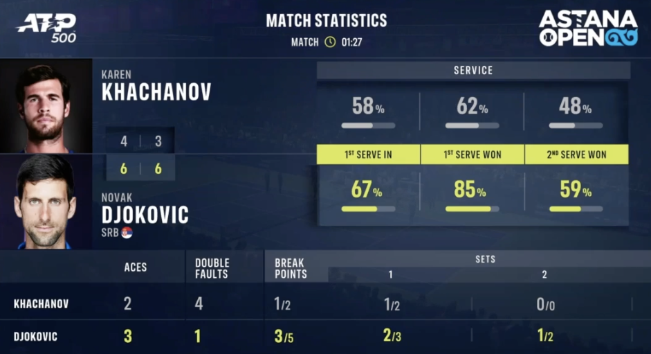 «ГИтоговая статистика матча. Карен старался и моментами был очень неплохо, но ему не хватило стабильности для того, чтобы обыгрывать Новака. Исход встречи — закономерная победа Джоковича, который в полуфинале может встретиться с Даниилом Медведевым в случае победы россиянина над испанцем Роберто Баутистой-Агутом.