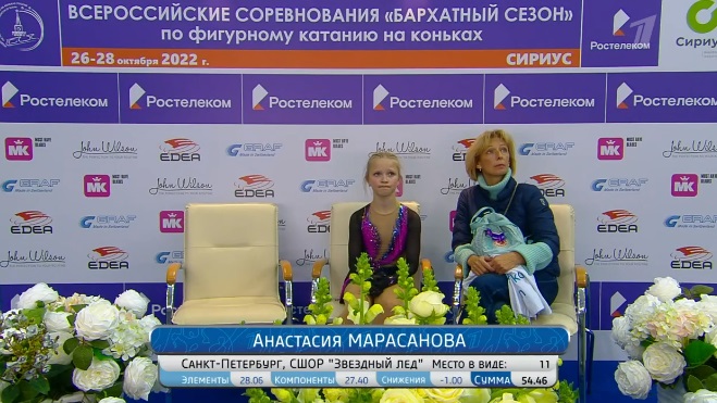 Двойной аксель в начале проката от Марасановой, затем тройной риттбергер и вращение четвертого уровня. А вот при исполнении каскада во второй части проката упала на тройном лутце, который был первым прыжком. Вращения были на четвертый уровень, а дорожка шагов — на второй.