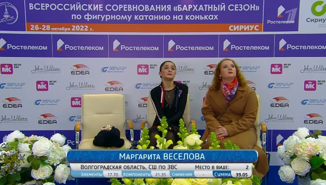 Сразу же приличный двойной аксель, а вот с тройного риттбергера упала. Вращение третьего уровня, каскад 3 лутц + 3 тулуп во второй части программы. Вращения были снова на третий уровень, а дорожка шагов — второго. Расстроилась очень после падения.