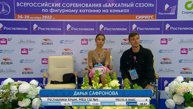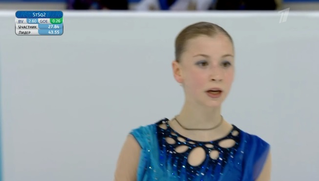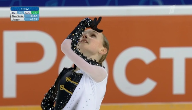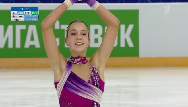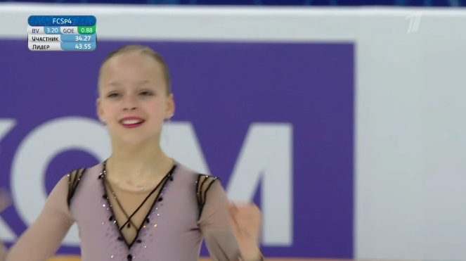 Кира Трофимова выходит на четвертое место. Особенно шикарен, конечно, был двойной аксель, который все судьи оценили на +3.