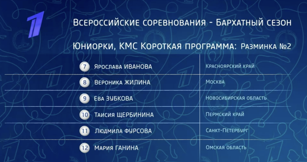 Началась разминка второй группы участниц, где выступит ученица Плющенко — Вероника Жилина.