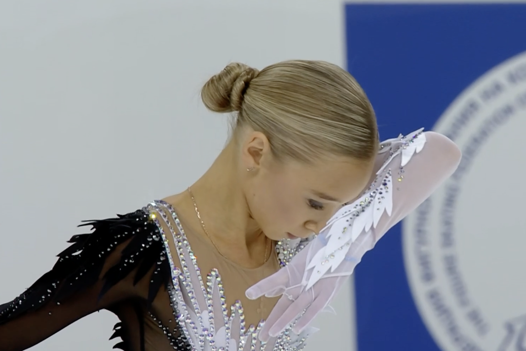 Следующей выступает Вероника Жилина из академии Плющенко. Она катается под нежную композицию «Лебедь» (Камиль Сен-Санс).