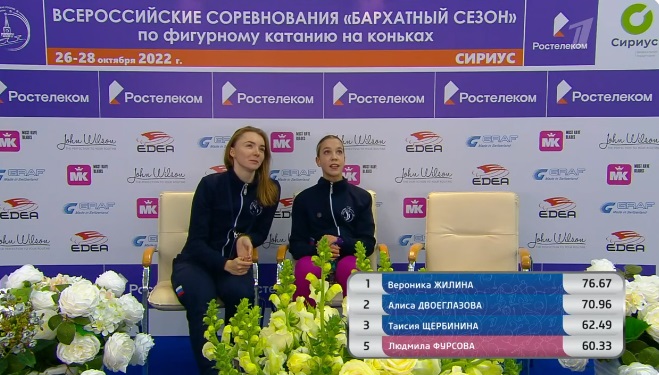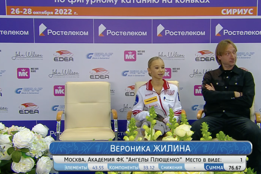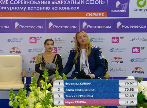 Жилина получает за свою короткую программу 76,67 балла! Она обходит почти на шесть баллов ученицу Тутберидзе Двоеглазову и становится лидером таблицы.